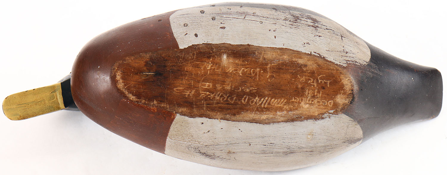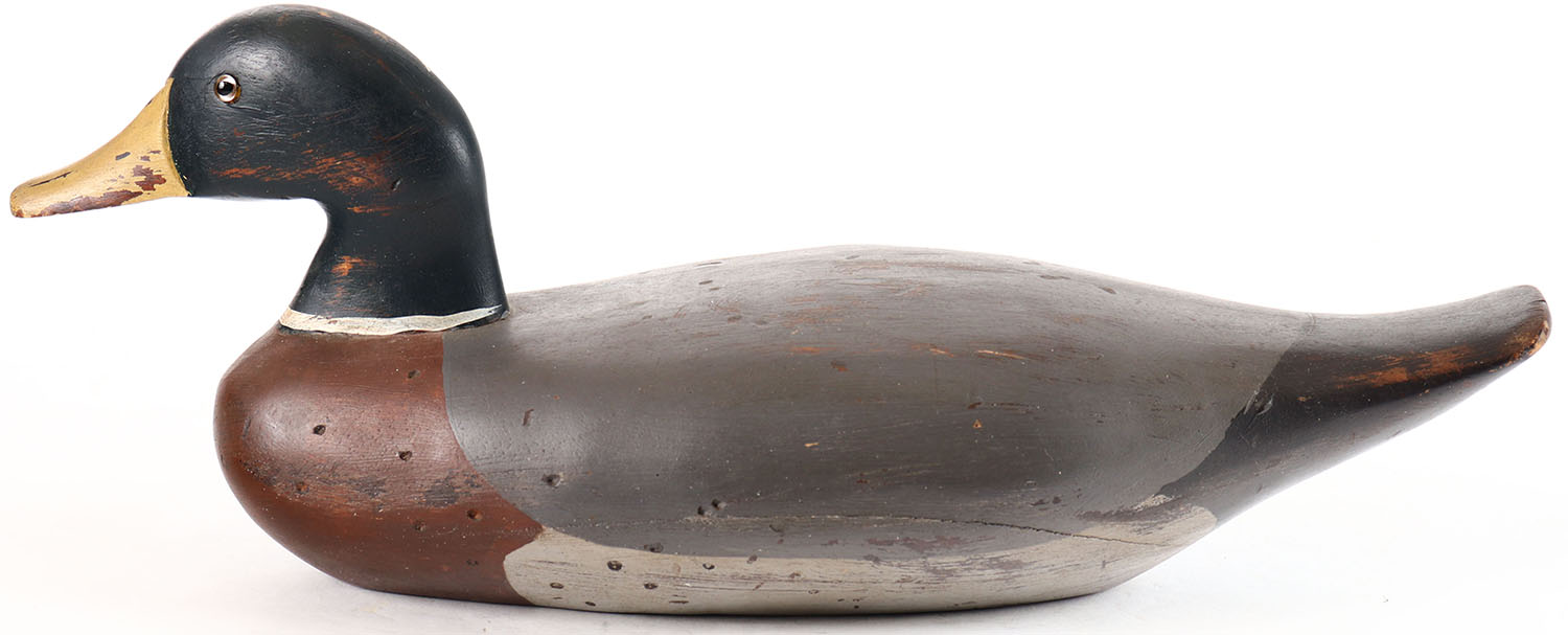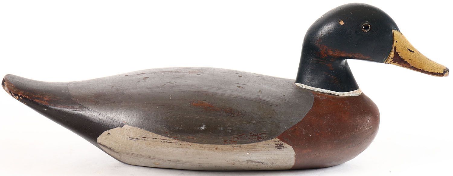 Mallard Drake by unknown maker with illegible signature on bottom, glass eyes, solid wood, maker distressed original paint, structurally excellent. Grade: Excellent + - Value: 10 to 30