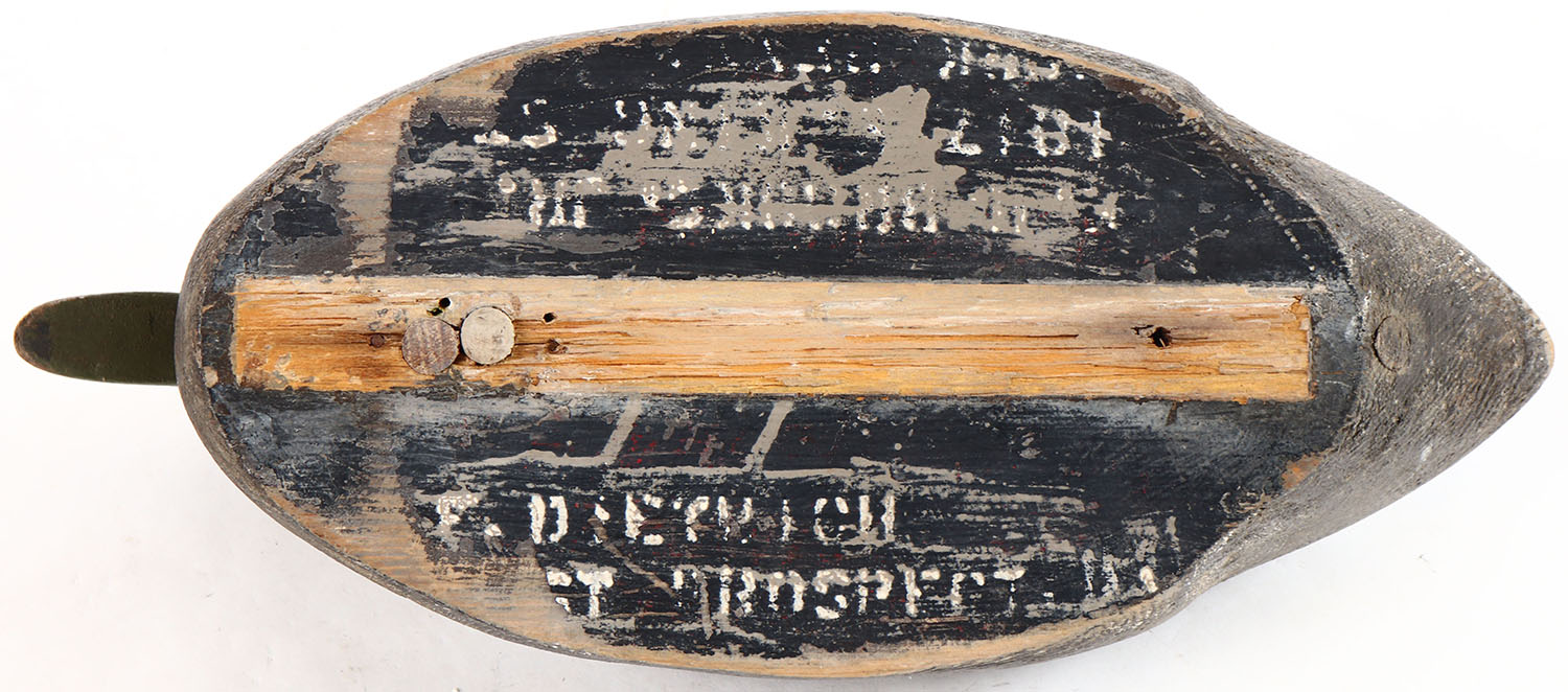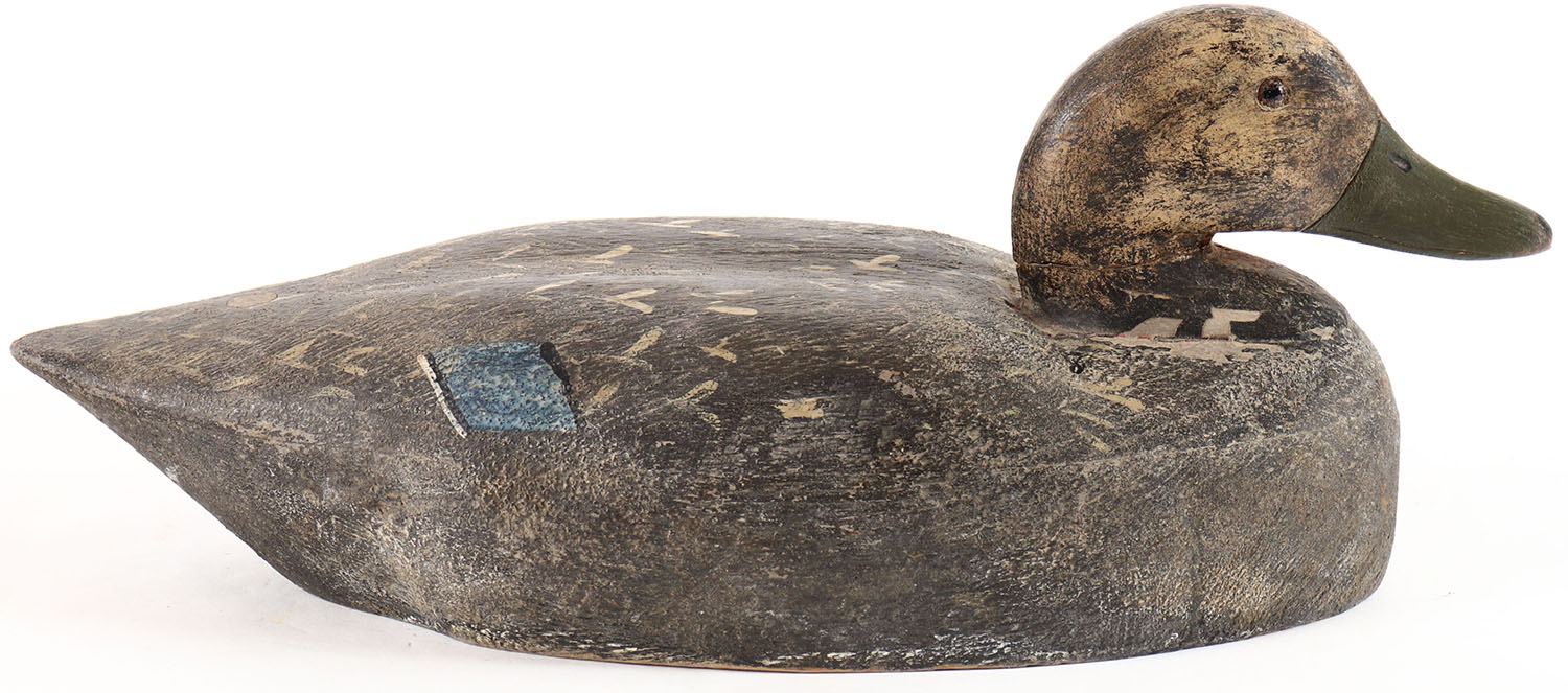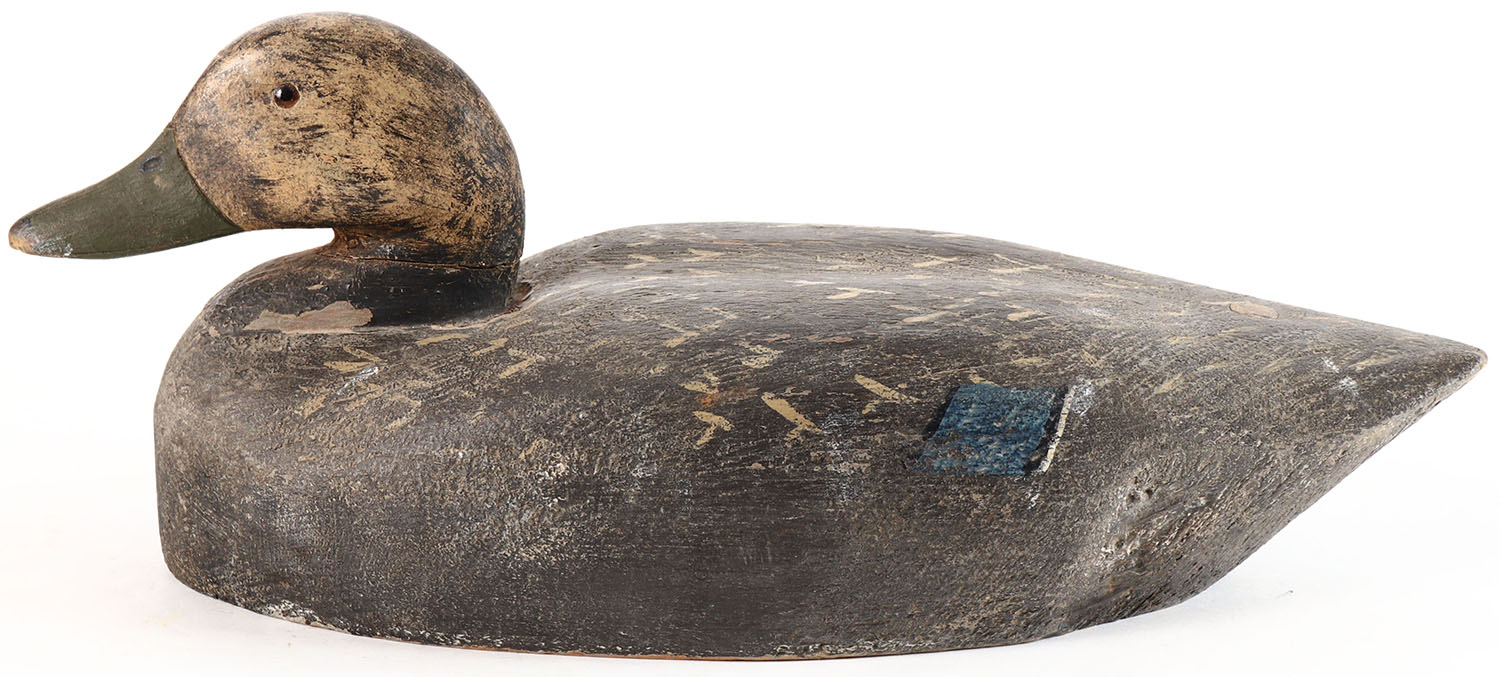 Black Duck by Herters Decoy Co., Waseca, MN, glass eyes, solid wood, hunter repaint, has age cracks on bottom. Grade: Very Good ++ - Value: 40 to 80