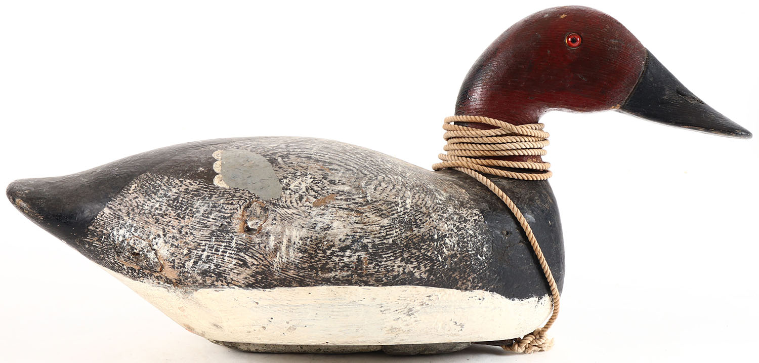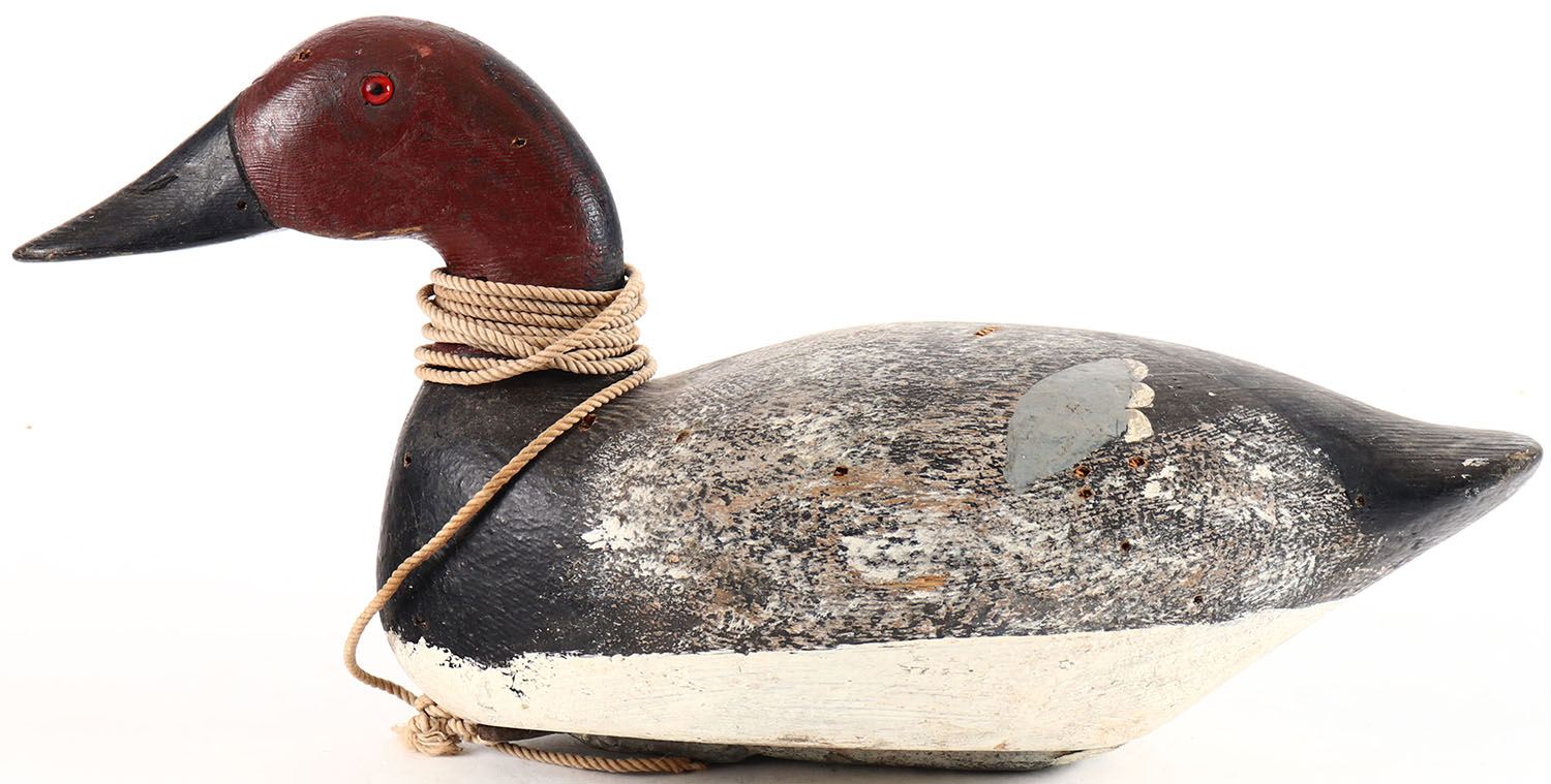 Canvasback Drake by unknown Wisconsin maker, glass eyes, solid wood, apparent original paint, structurally excellent. Grade: Excellent - Value: 40 to 80