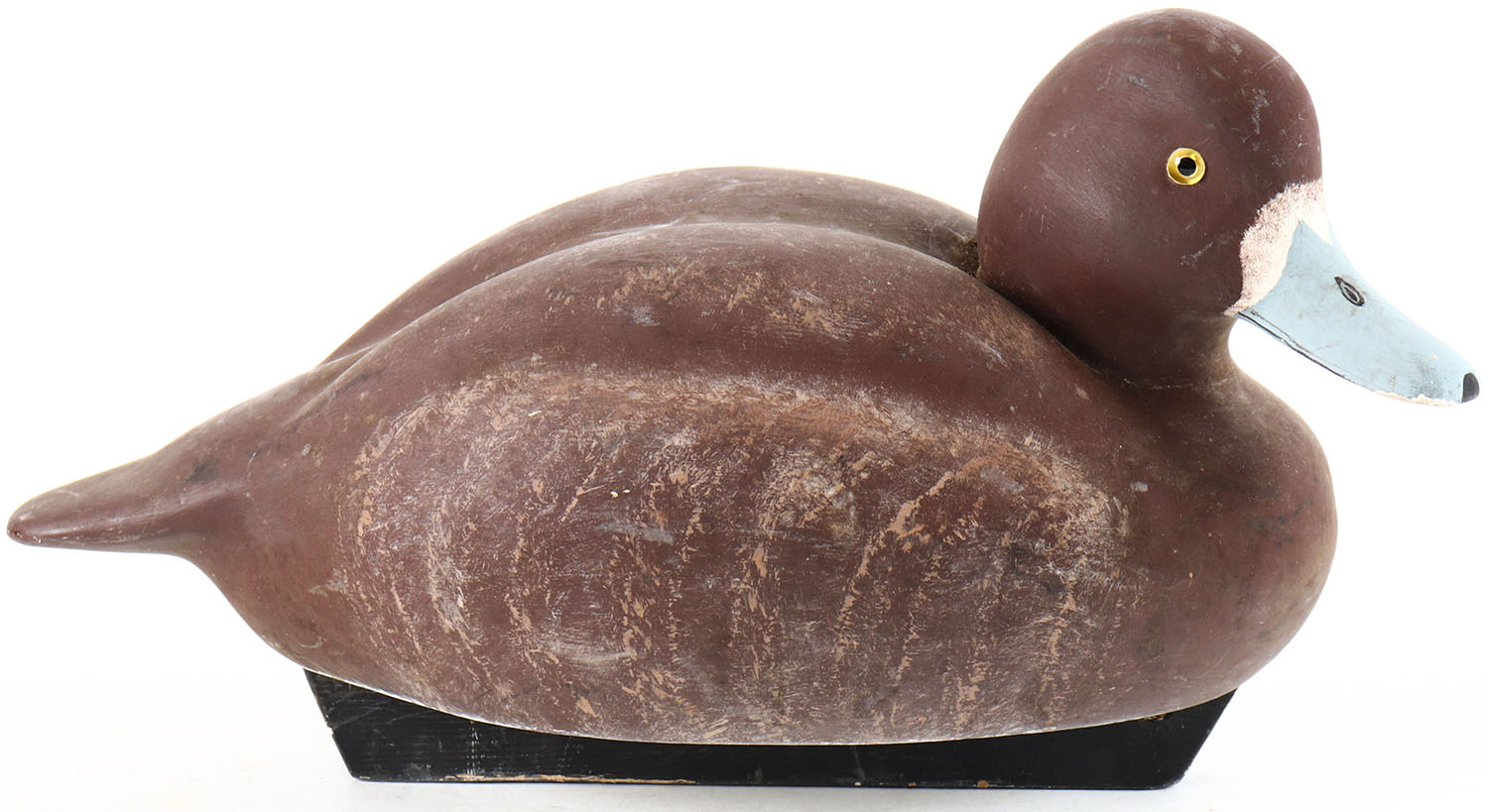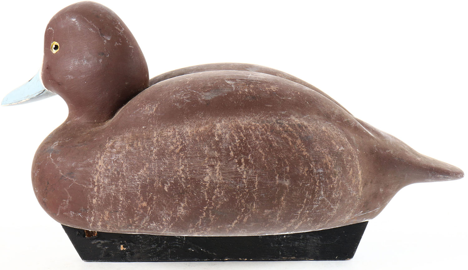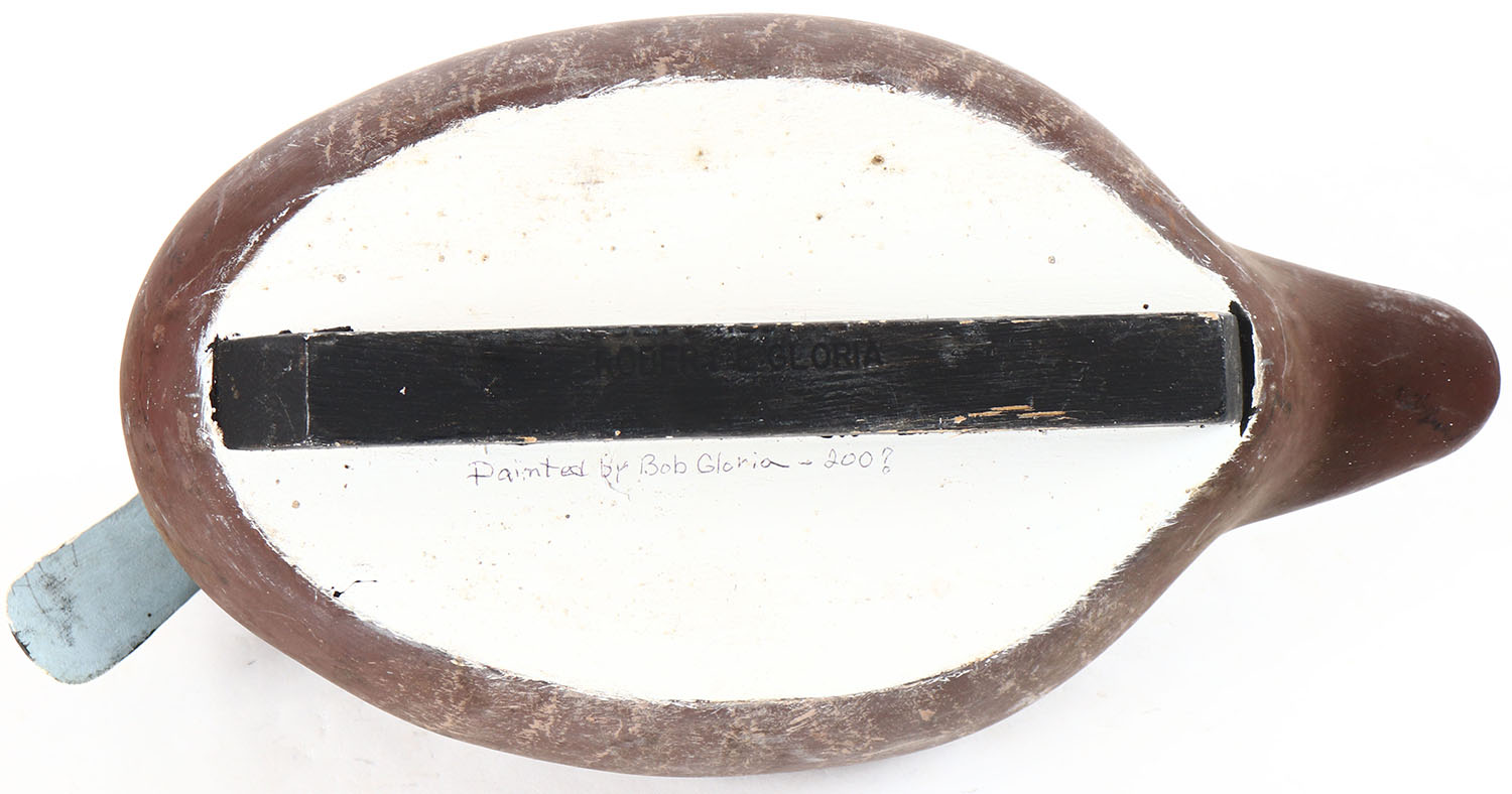 Bluebill Hen by Bob Gloria, glass eyes, solid wood, original paint, structurally excellent, signed and branded by BOB GLORIA on bottom. Grade: Excellent + - Value: 20 to 40
