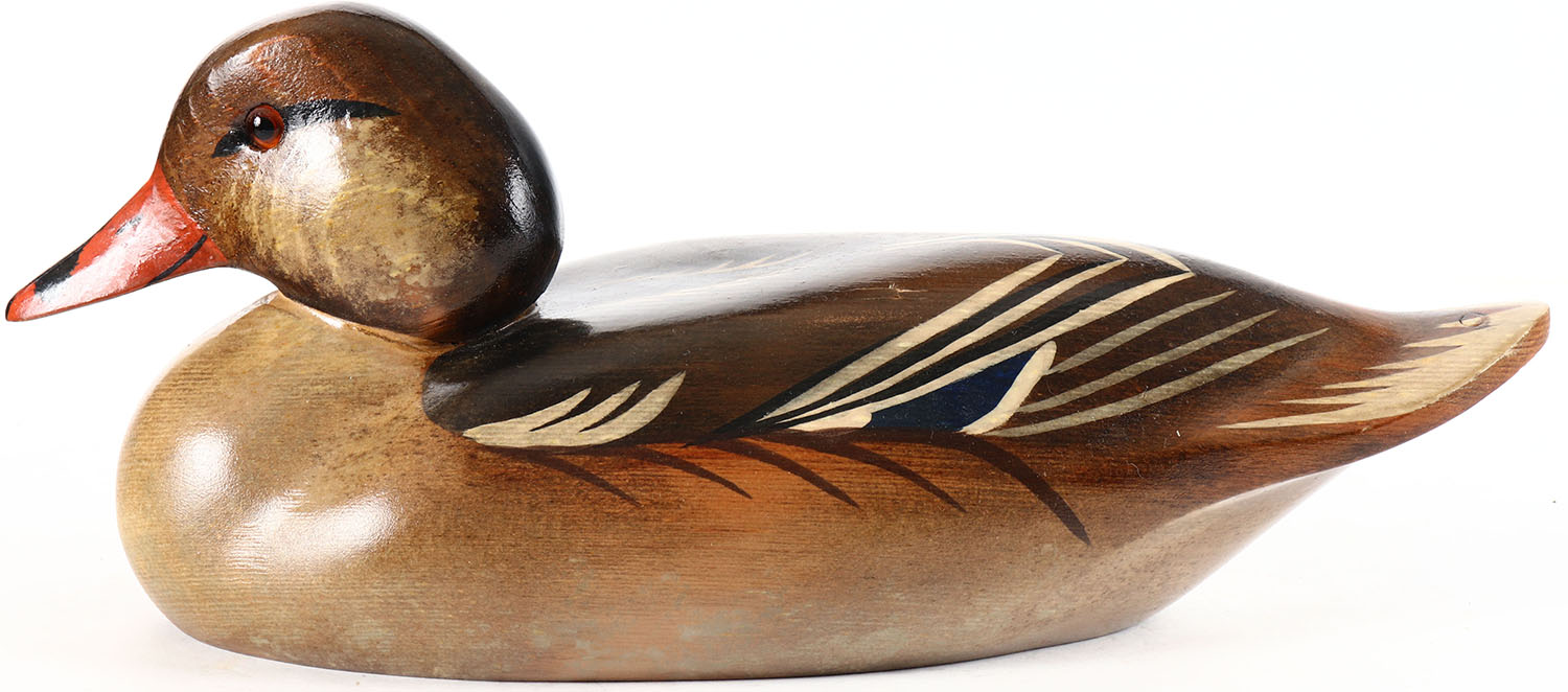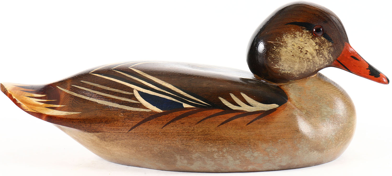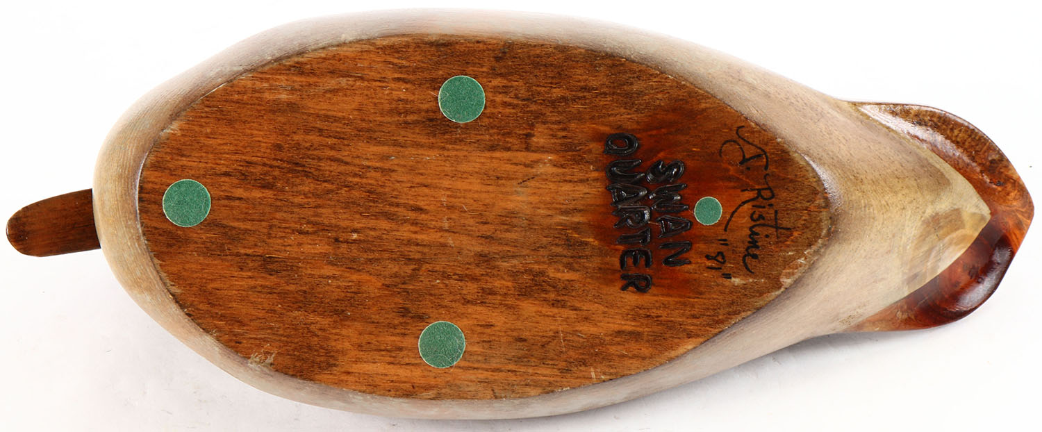 Mallard Hen by Swan Quarter Decoys, glass eyes, solid wood, original paint, structurally excellent, branded and signed by painter T. RISTINE on bottom., Grade: Excellent ++ - Value: 20 to 40