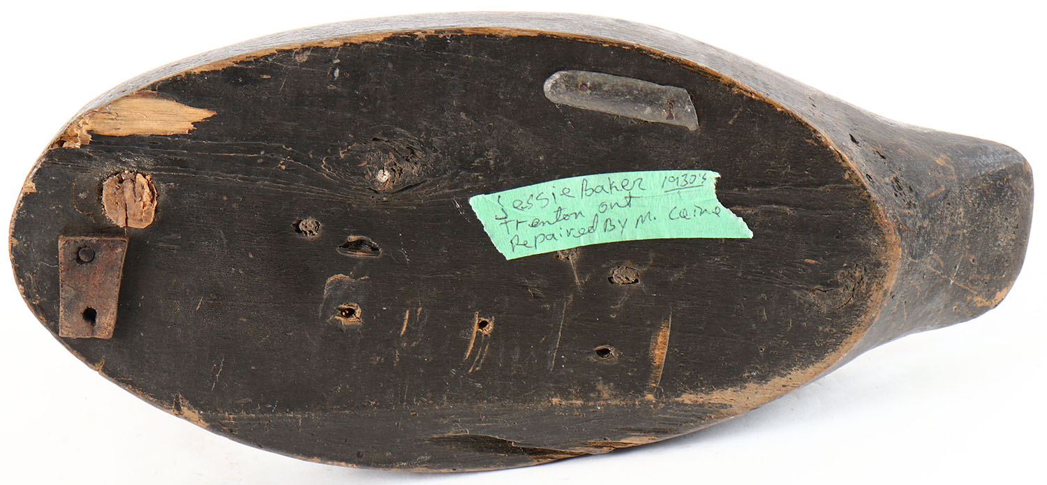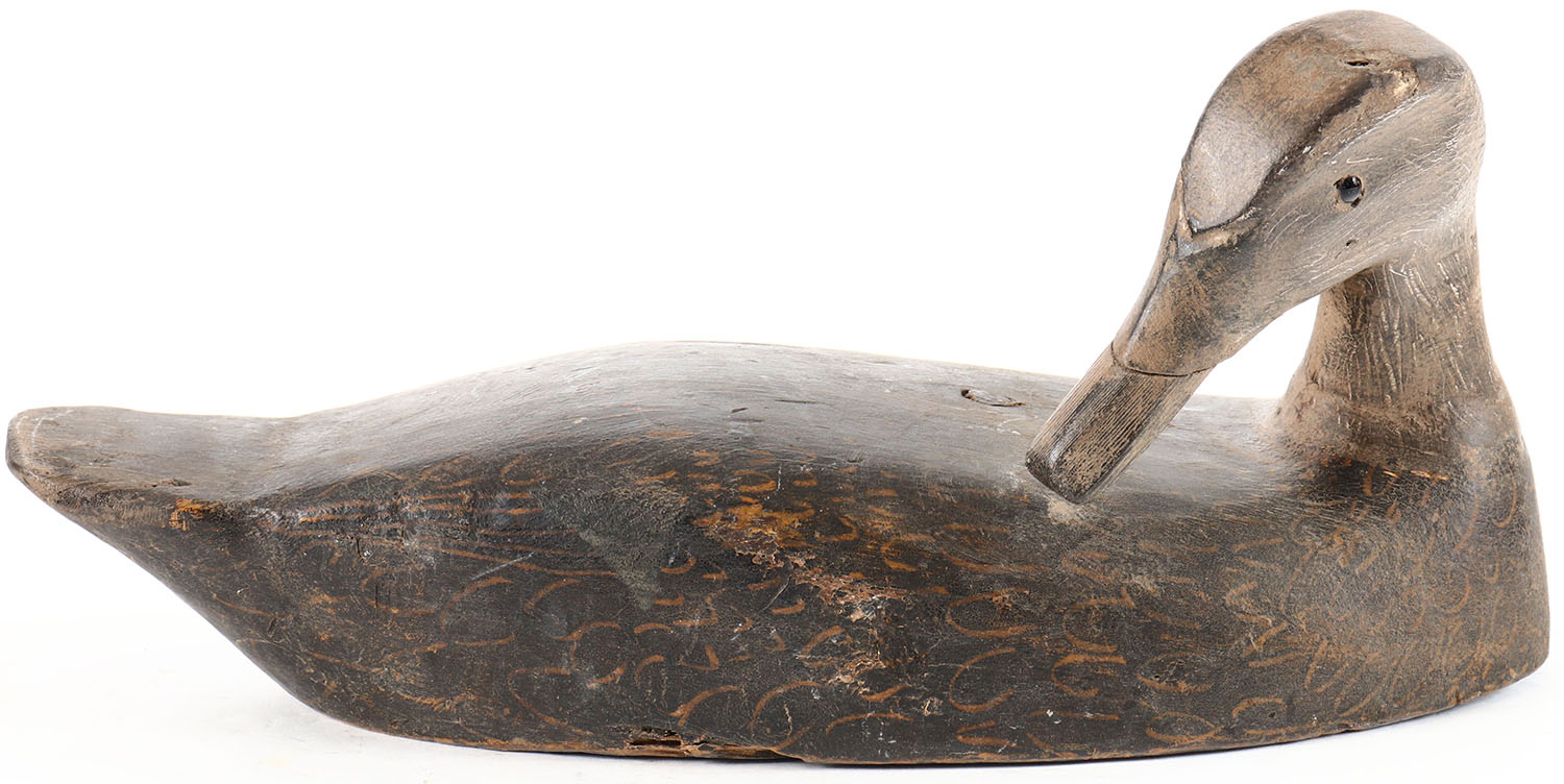 Preening Black Duck by Jessie Baker, Trenton, Ont, head repaired, repainted and possibly turned into a preener, glass eyes, solid wood, original paint, structurally excellent. Grade: Excellent - Value: 20 to 40