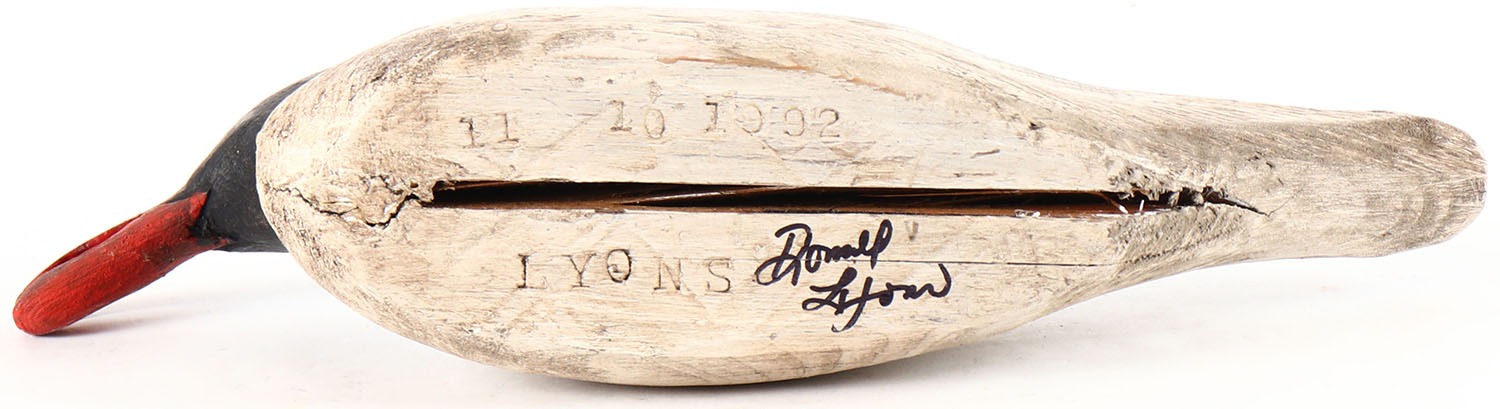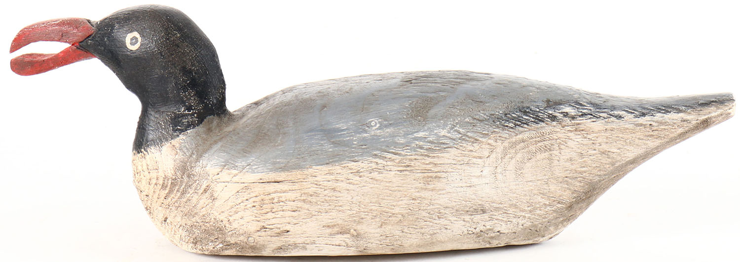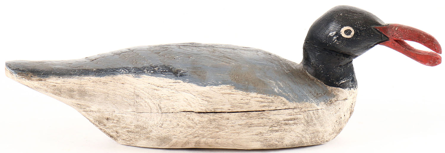Black Headed Gull by Donald Lyons, Norfolk, VA, painted eyes, solid wood, original paint, has age cracks on side of body and bottom, branded on bottom by maker. Grade: Very Good - Value: 20 to 40