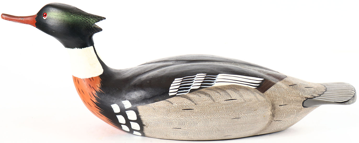 Red Breasted Merganser from Ducks Unlimited, produced by Wildfowler Decoys Inc., glass eyes, solid wood, original paint with comb painting on both sides of body, structurally excellent, signed and branded on bottom by WILDFOWLER DECOYS INC. Grade: Excellent ++ - Value: 30 to 60
