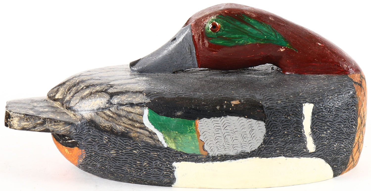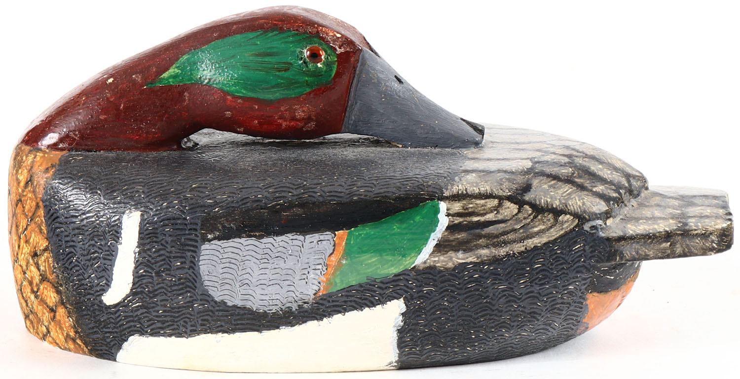 Small Preening Green Winged Teal Drake by Stanley Goose Podowicz, Dalzell, IL, glass eyes, solid wood, original paint, structurally excellent. Grade: Very Good ++ - Value: 30 to 60