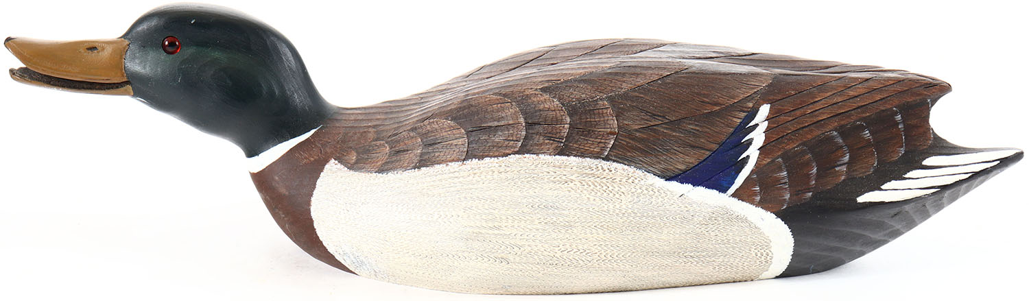 Swimming Mallard Drake by Barbara Kearns, St. Louis, MO. Glass eyes, solid wood, original paint with comb painting on both sides of body, structurally excellent, signed and branded on bottom by BARBARA KEARNS. Grade: Excellent ++ - Value: 10 to 30