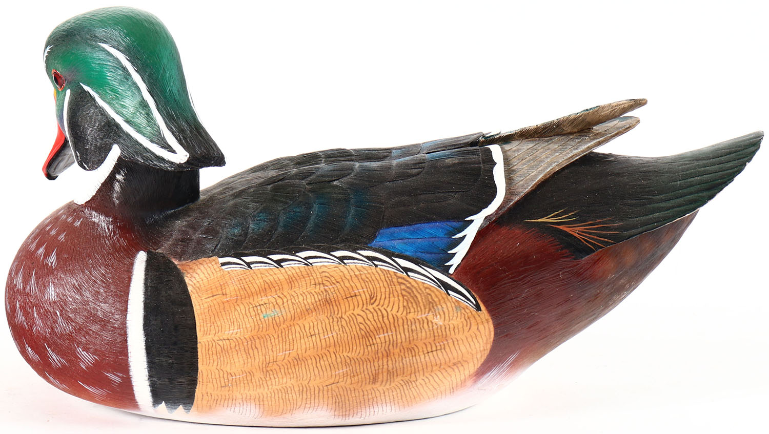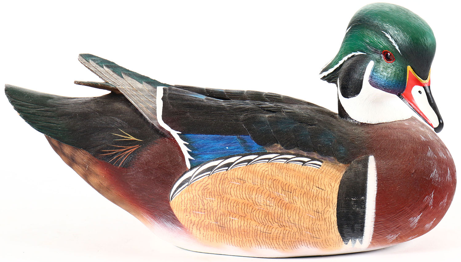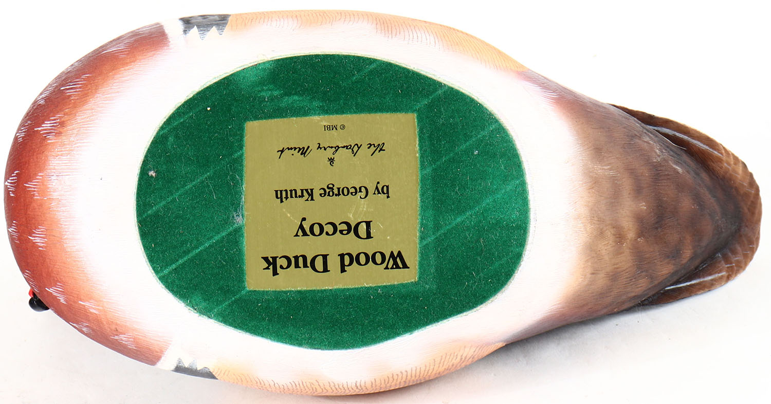 Woodduck Drake by George Kruth, glass eyes, solid resin, original paint, structurally excellent, branded by GEORGE KRUTH on bottom. Grade: Excellent + - Value: 10 to 40