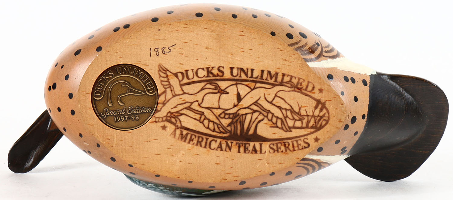 Blue Winged Teal Drake by Ducks Unlimited American Trial Series, glass eyes, solid wood, original paint, structurally excellent, branded by DUCKS UNLIMITED on bottom. Grade: MINT - Value: 10 to 40