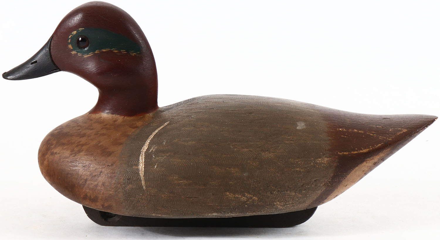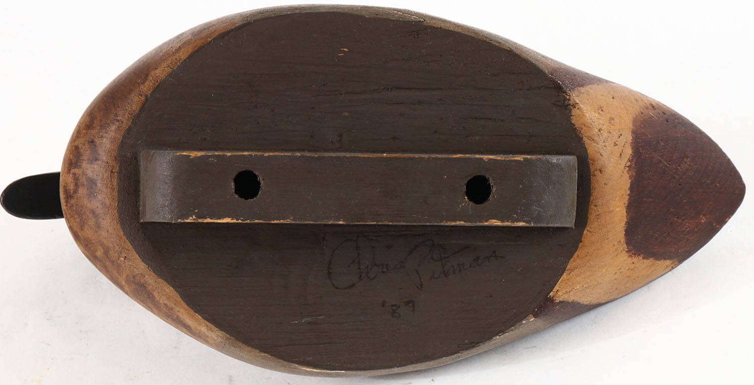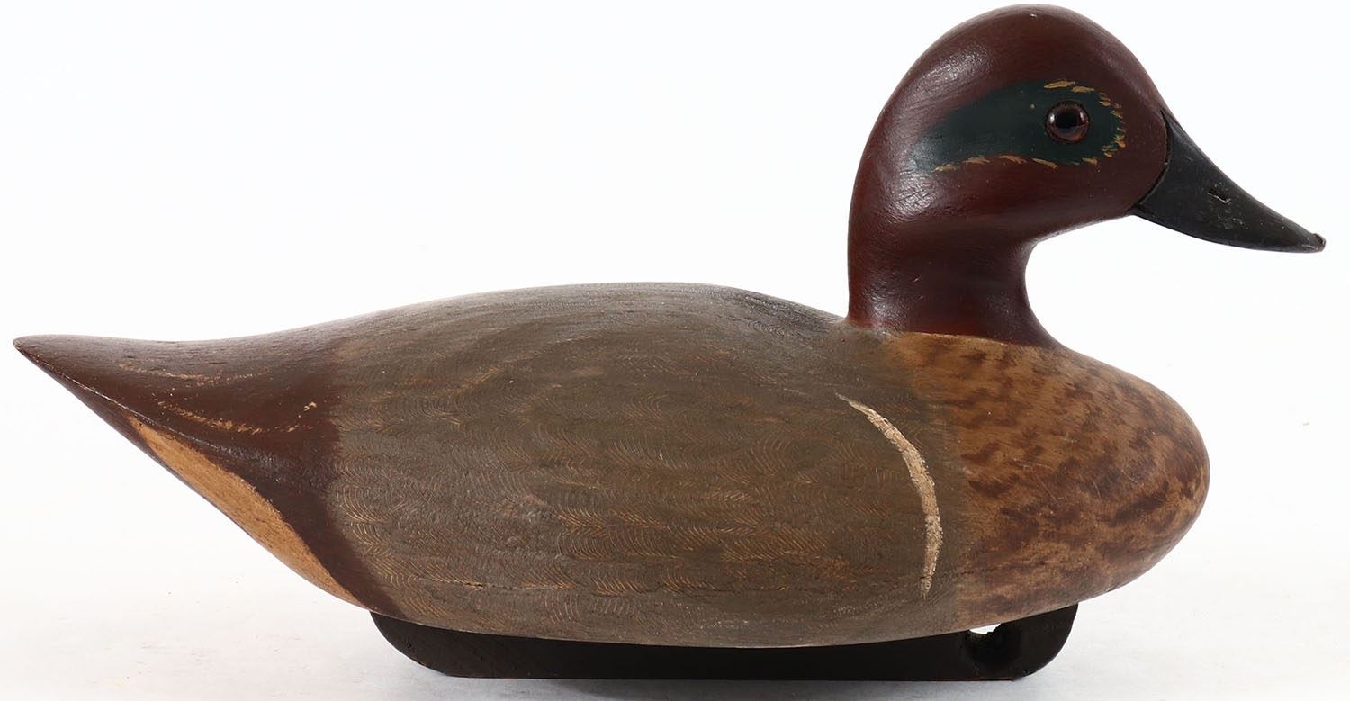 Green Winged Teal Drake possibly by C.F. Pittman, Trenton, NJ, glass eyes, solid wood, original paint, structurally excellent, signed on bottom. Grade: Excellent + - Value: 30 to 60