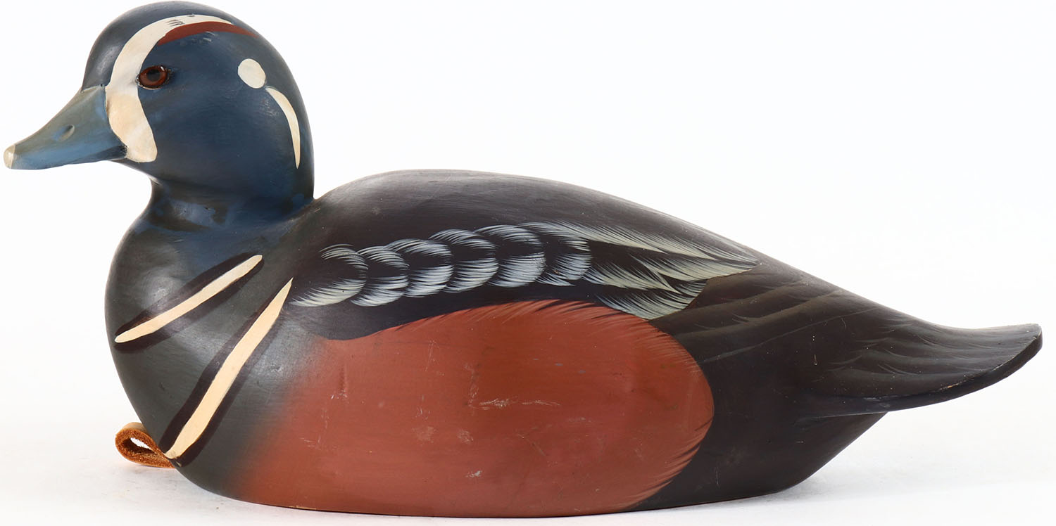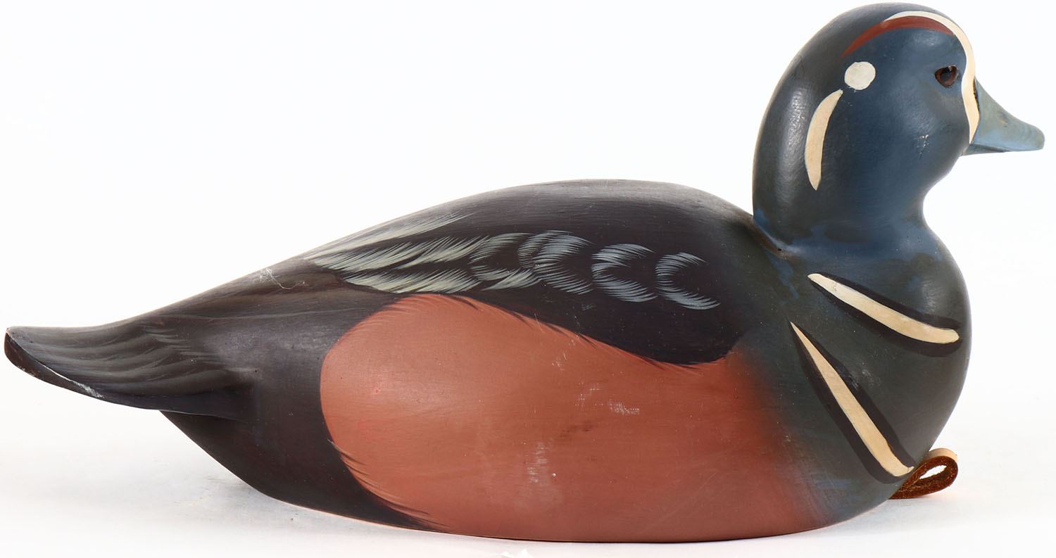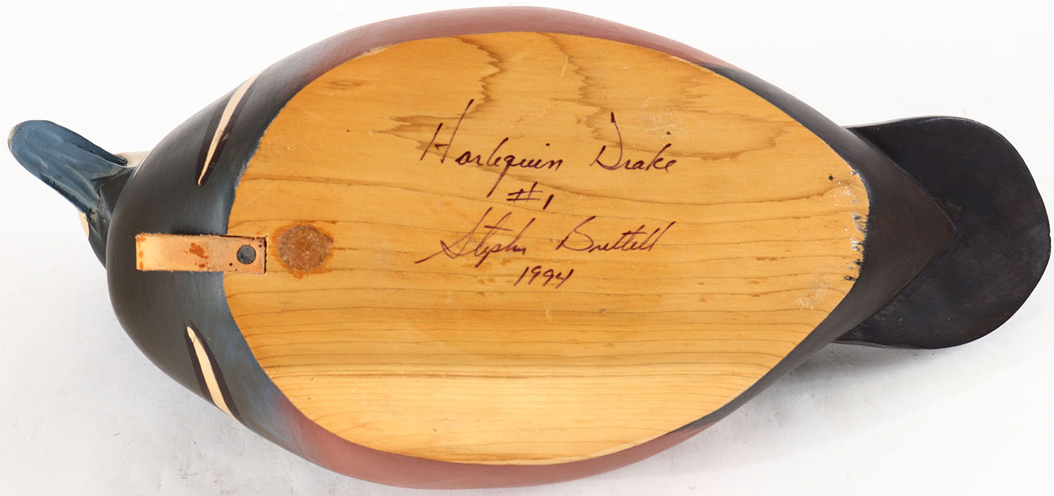 Harlequin Drake by Stephen Brittell, Biddeford, ME, glass eyes, solid wood, original paint, structurally excellent, signed on bottom. Grade: Excellent ++ - Value: 80 to 160