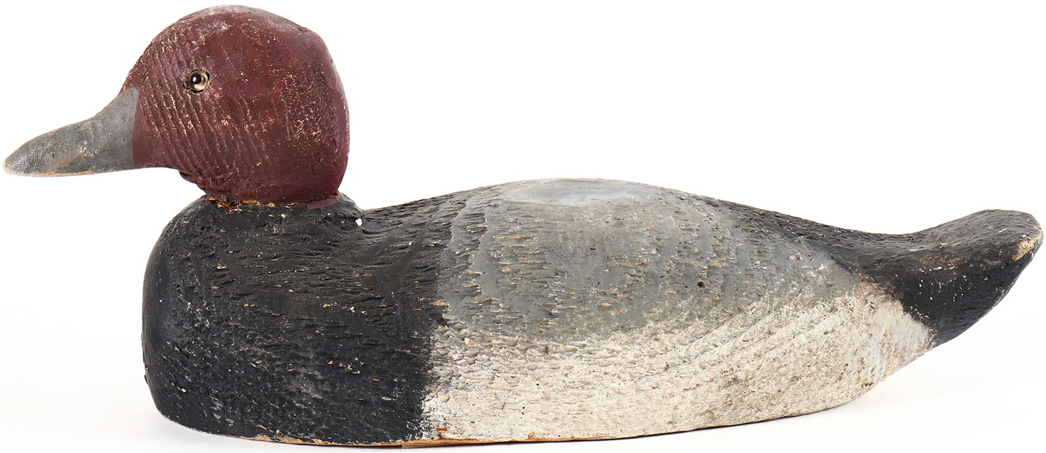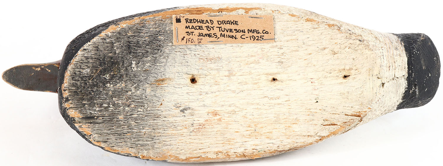 Redhead Drake by Tuveson MFG. Co. ST. James, Minn. Glass eyes, solid wood, original paint, wear to body. Grade: Very Good + - Value: 30 to 60