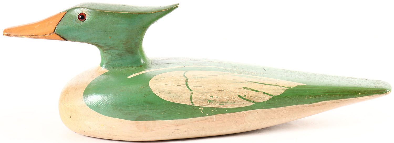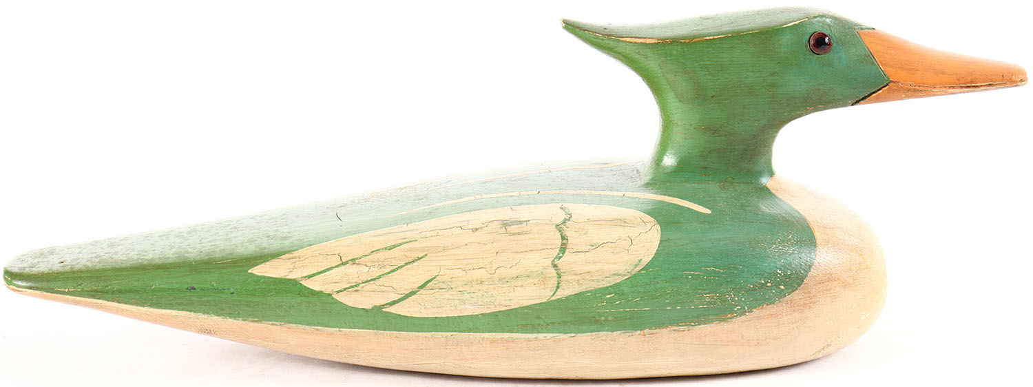 Hooded Merganser by unknown maker, glass eyes, solid wood, original paint, structurally excellent. Grade: Very Good + - Value: 2 to 20