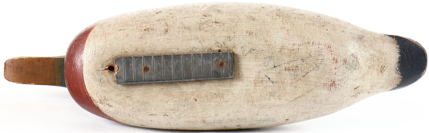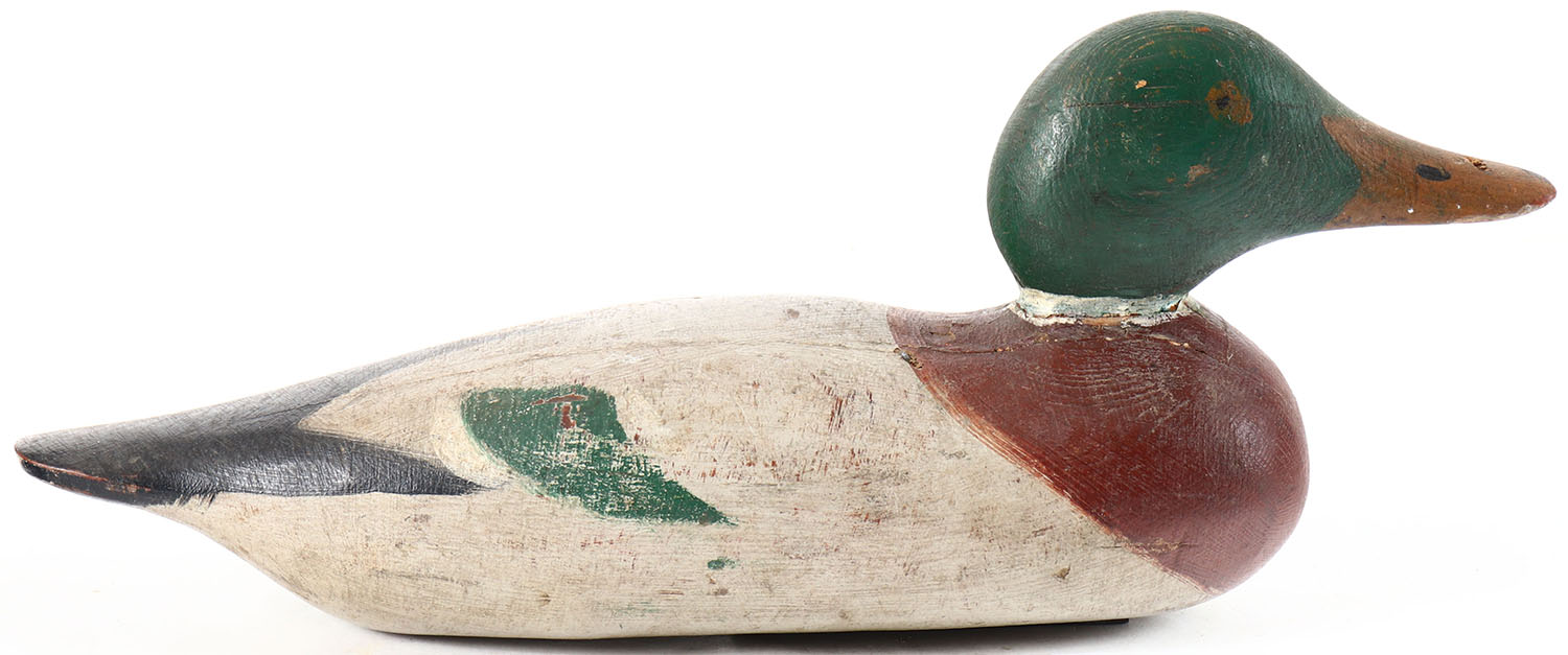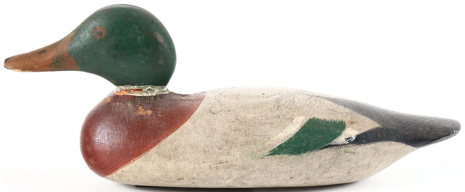 Mallard Drake by Mason Decoy Company, Detroit, MI, 1896-1924, painted eye model, solid wood, original paint, neck filler is cracked but all original. Grade: Very Good + - Value: 70 to 150