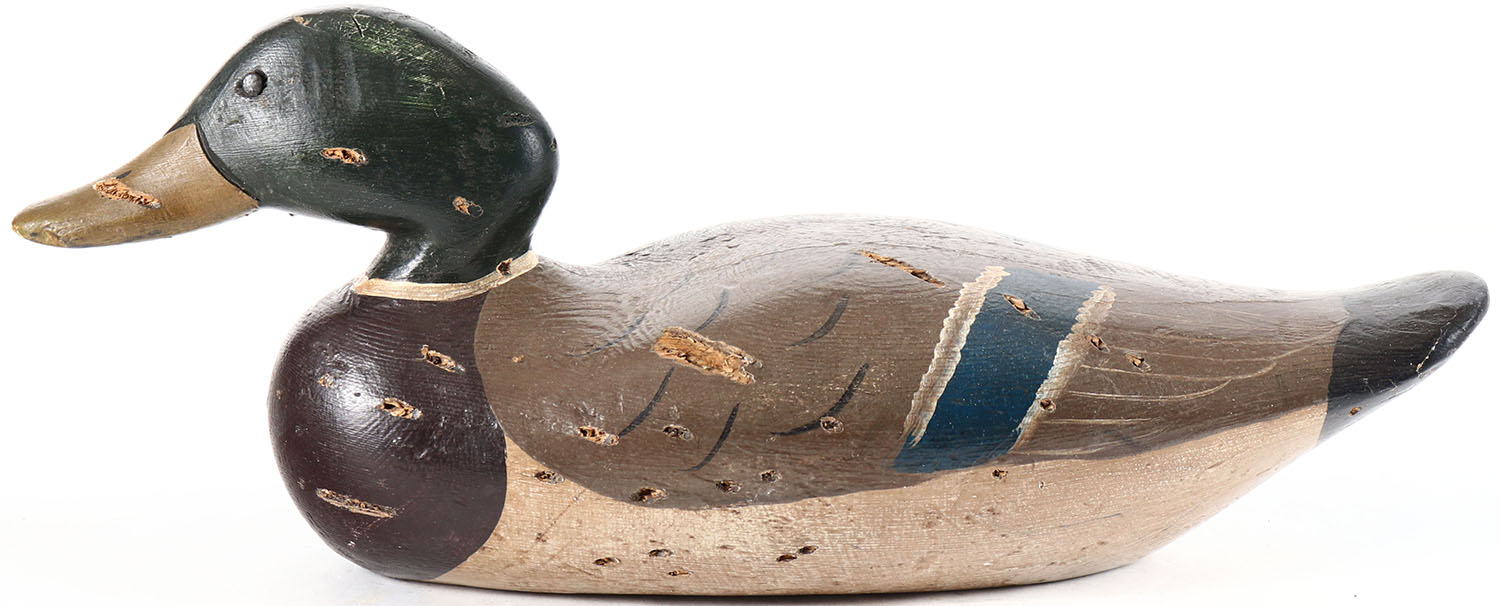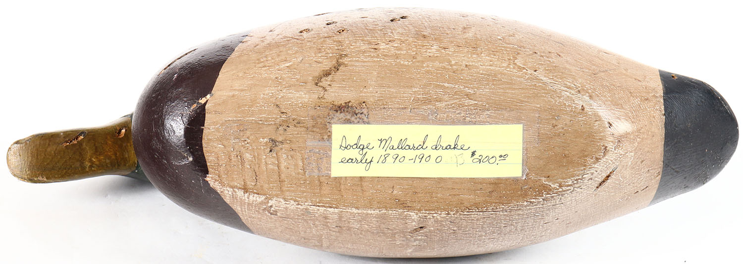 Mallard Drake by Dodge Decoy Factory, Detroit, MI, 1883-1893, tack eyes, solid wood, restored paint, has pellet holes on body and head. Grade: Very Good - Value: 40 to 80