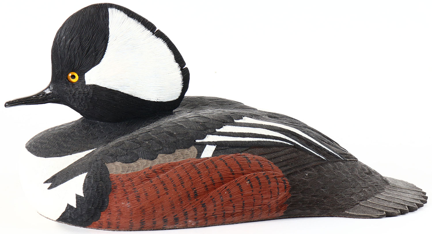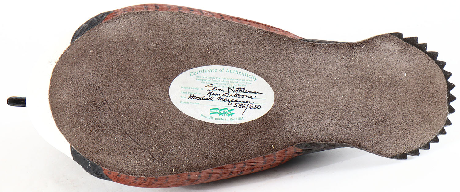 Hooded Merganser by Sam Nottleman, glass eyes, solid wood, original paint, structurally excellent, signed on bottom by SAM NOTTLEMAN on bottom. Grade: Excellent + - Value: 20 to 40