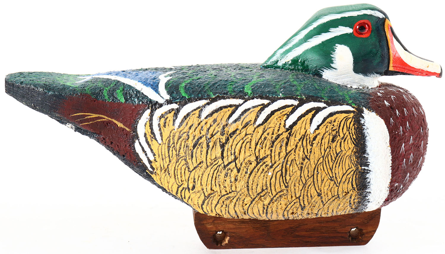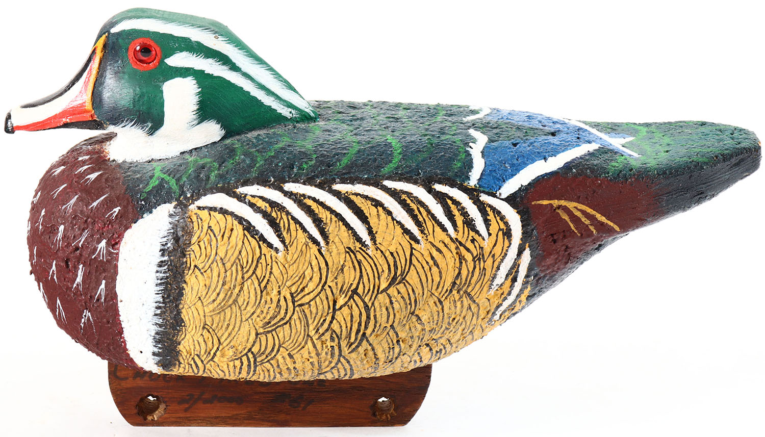 Woodduck Drake by unknown maker, glass eyes, solid cork body, original paint, structurally excellent. Grade: Excellent + - Value: 10 to 30