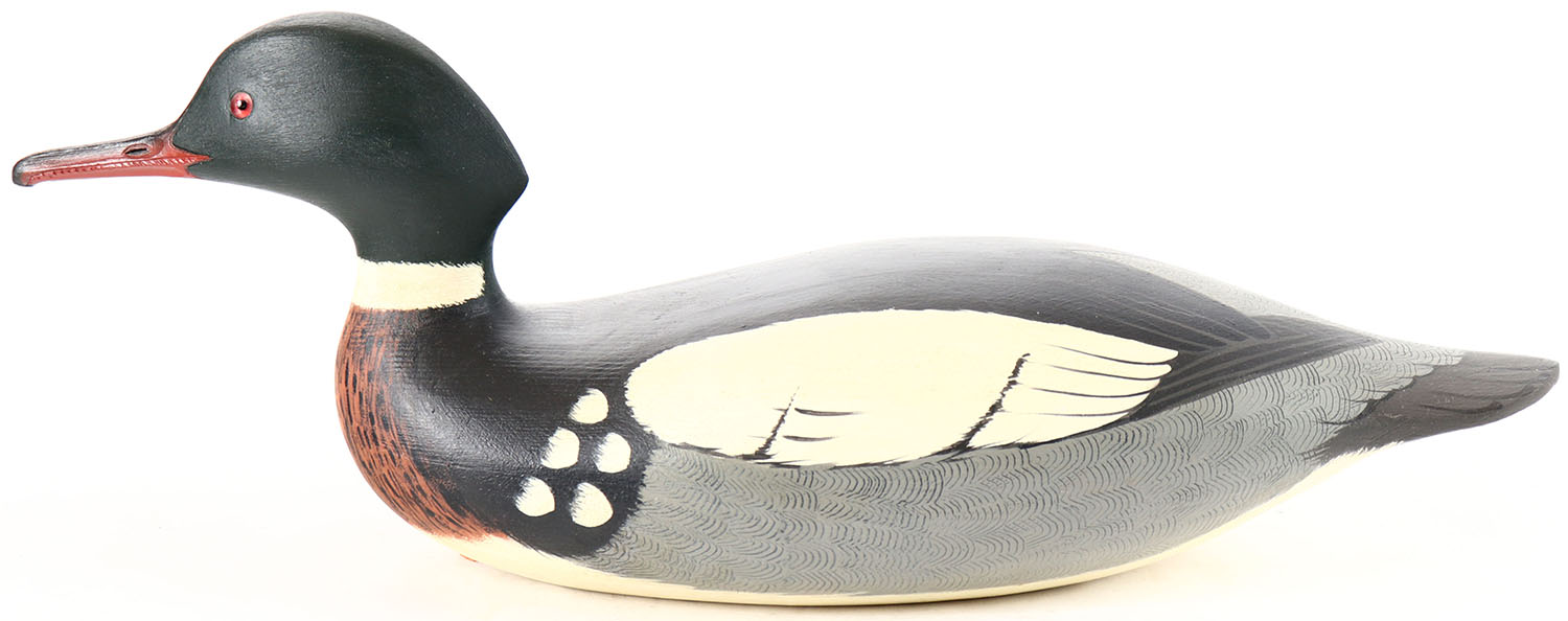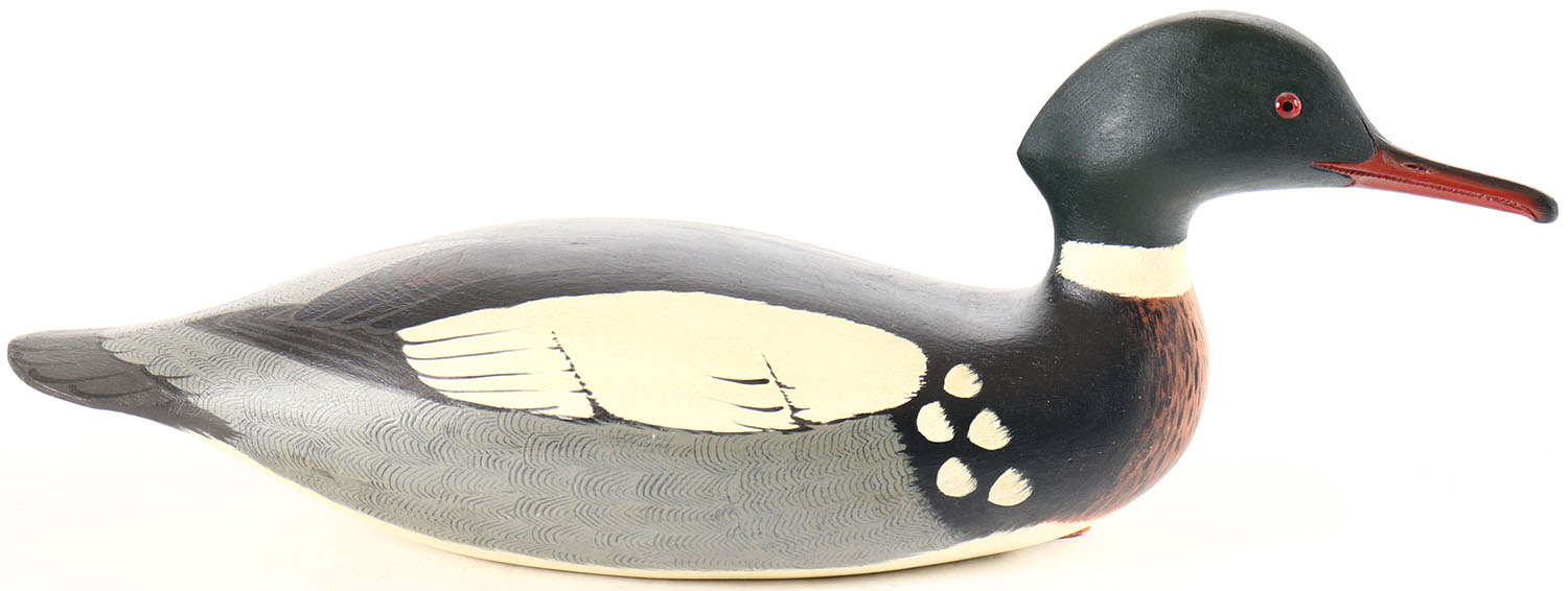 Red Breasted Merganser by L. Rucker, Maple Valley WA, glass eyes, overall length is 18 inches, hollow wood, mint original paint. Grade: MINT - Value: 100 to 200