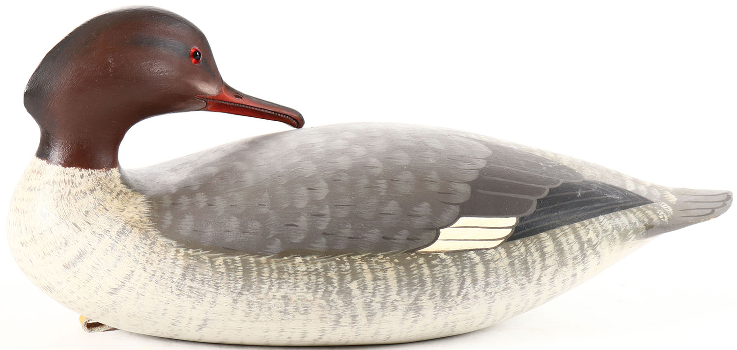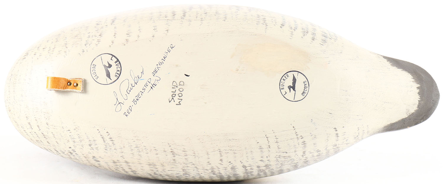 Red Breasted Merganser by L. Rucker, Maple Valley WA, glass eyes, 14 inches, solid wood, mint original paint. Grade: MINT - Value: 100 to 200