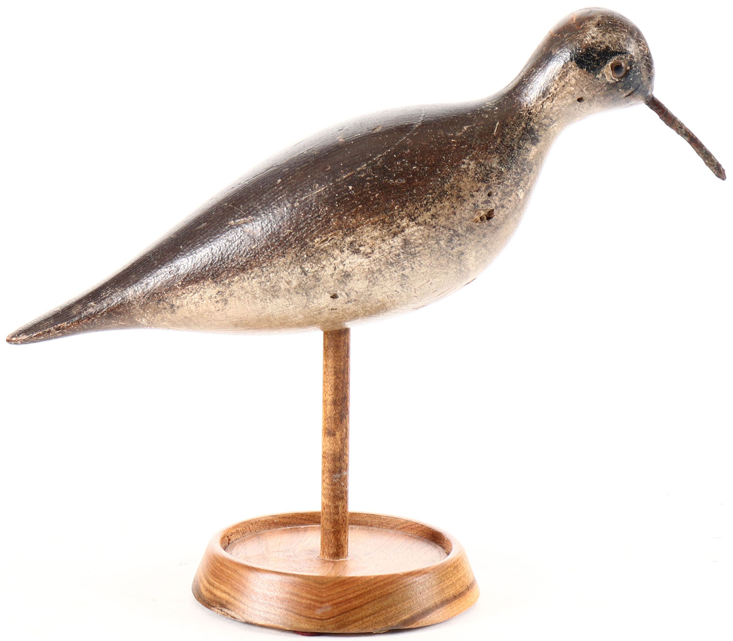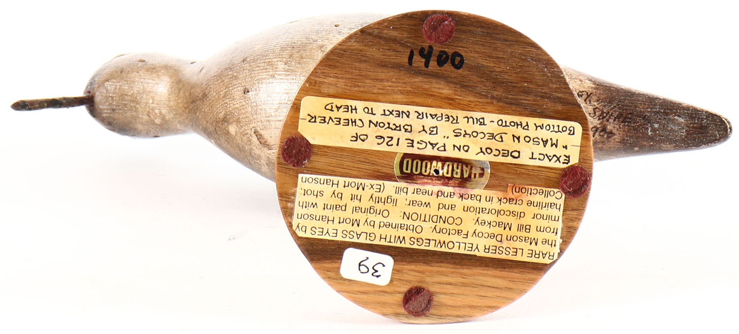 Mason Yellowlegs Shorebird by the Mason Decoy Co., glass eyes, solid wood, thw following is a quote on the bottom of the decoy stand: 'Rare Lesser Yellowlegs with Glass Eyes by the Mason Decoy Factory. Obtained by Mort Hanson from Bill Mackey. Condition: Original paint with minor discoloration and wear; lightly hit by shot; hairline crack in back and near bill (Ex-Mort Hanson Collection). Exact Decoy on Page 126 of Mason Decoys by Byron Cheever. Bottom Photo - Bill repair next to head. Grade: Good - Value: 800 to 1200