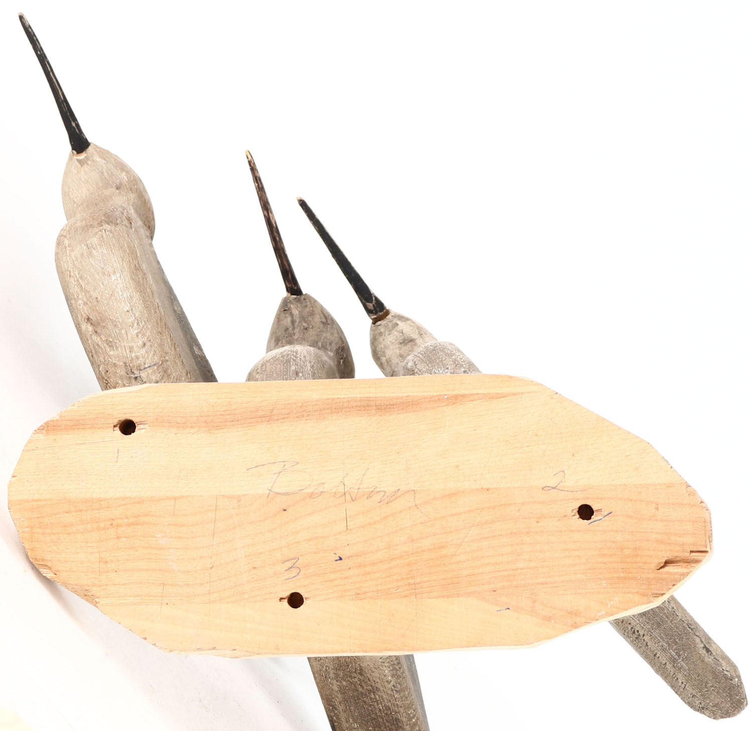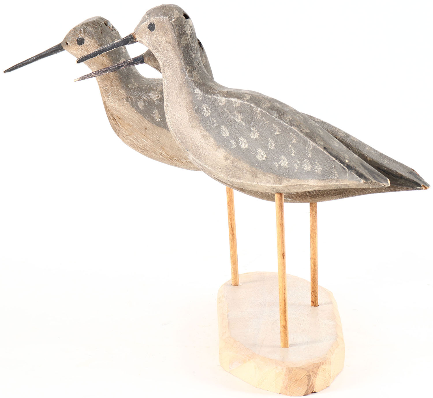 Lot of three Yellowlegs flatties, by unknown maker, painted eyes, on wood stand, original aged paint, illegible signature on bottom. Grade: Very Good ++ - Value: 30 to 60