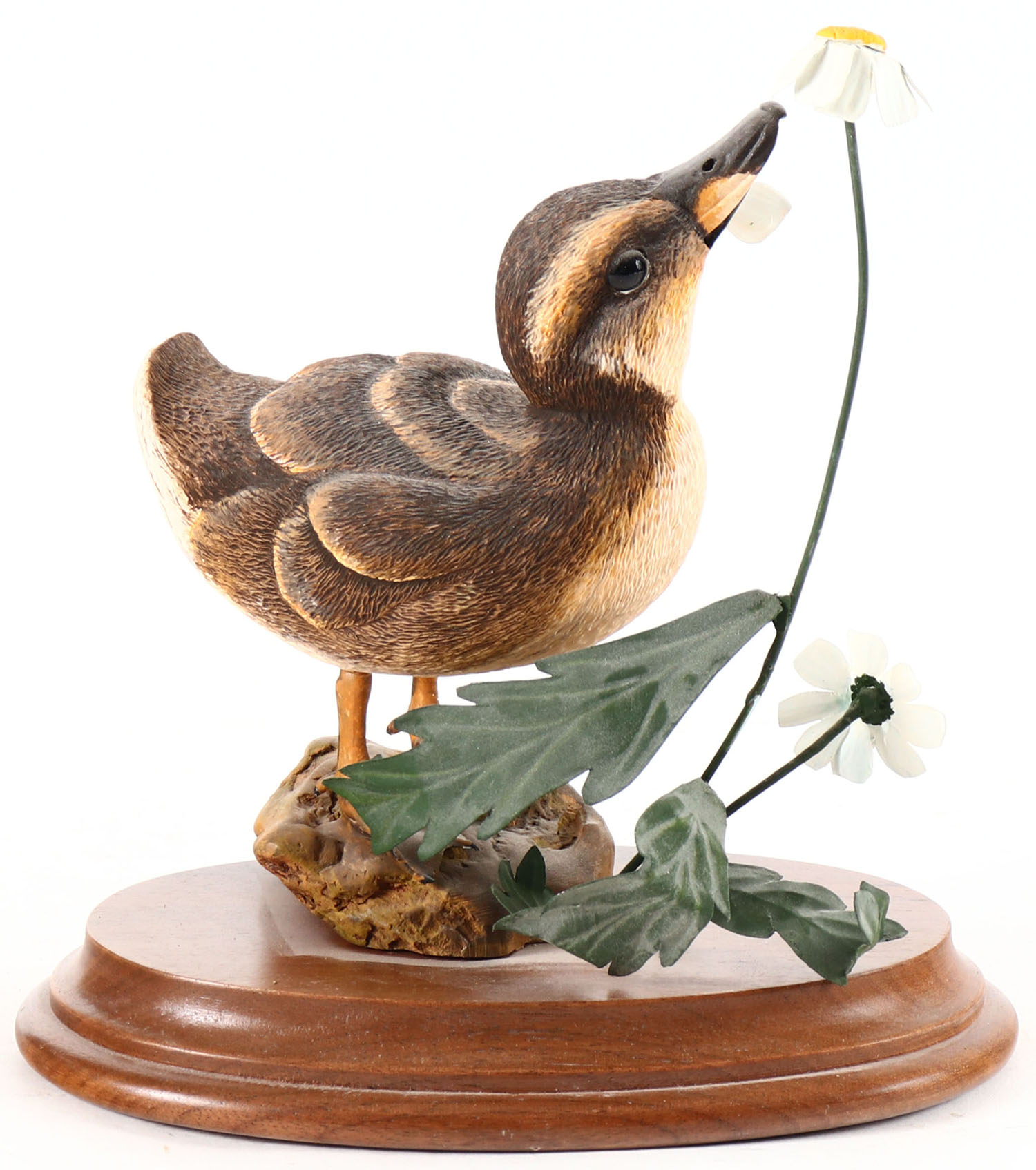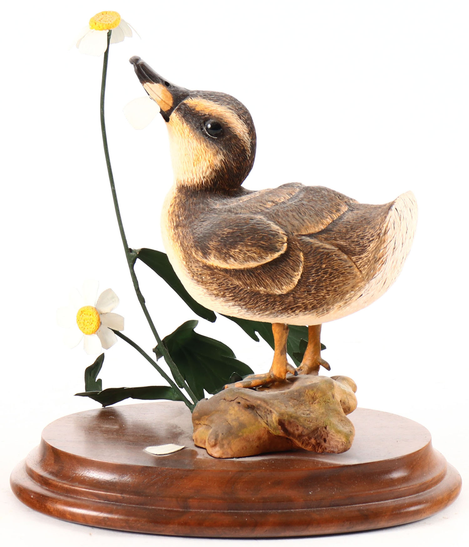 Mallard Chick ''She loves me, she loves me not'' by Jeanne B. Hiss, Reistertown, MD, glass eyes, solid wood on wood base, has flowers on base, original paint, structurally excellent, signed on bottom. Grade: MINT + - Value: 10 to 50