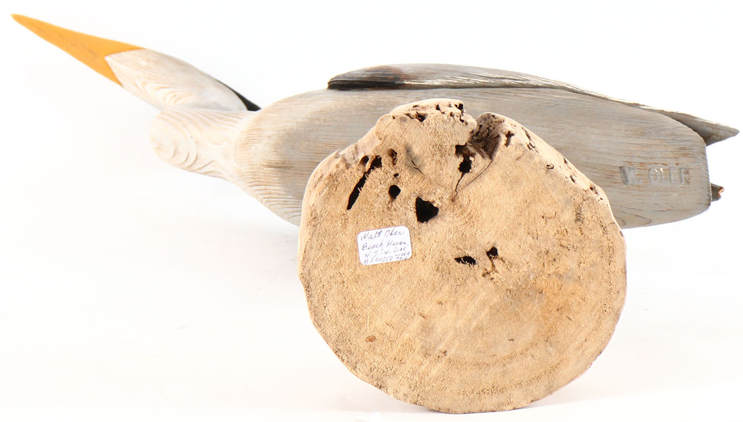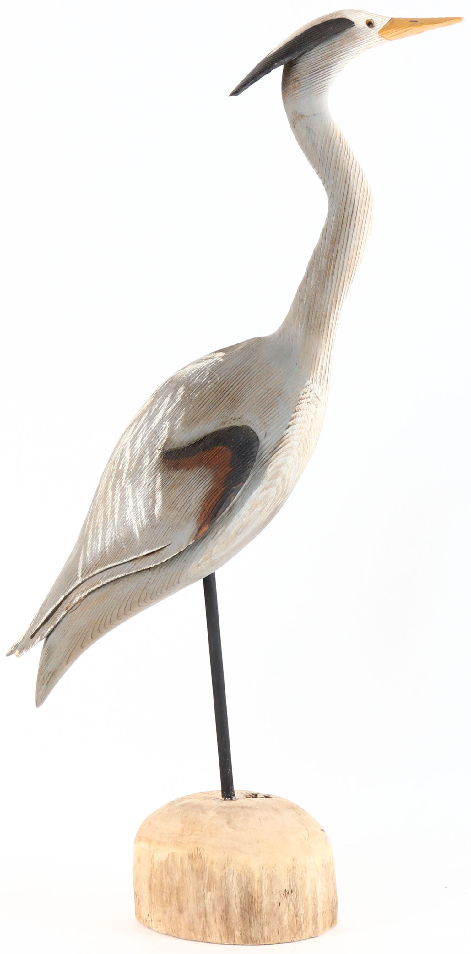 Blue Heron, by Walt Oler, Beach Haven, NJ, glass eyes, half size at 22 tall, solid wood on wood stand, original paint, structurally excellent. Grade: Excellent - Value: 20 to 40