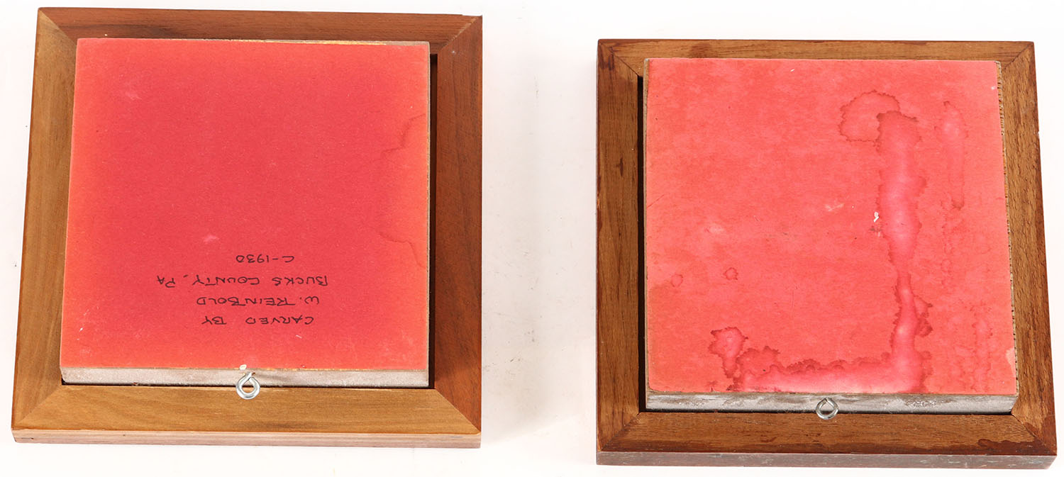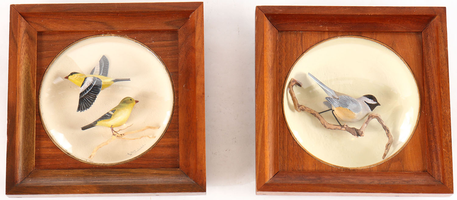 Lot of 2 carvings, (1) Glass covered wooden Diorama featuring miniature pair of Gold Finch made by Wm. Reinbold, 19262018, Chestertown MD, mounted on driftwood, glass eyes, solid wood, mint original paint, signed, frame (OAL 7.25 inches x 7.25 inches), structurally excellent. Grade: MINT