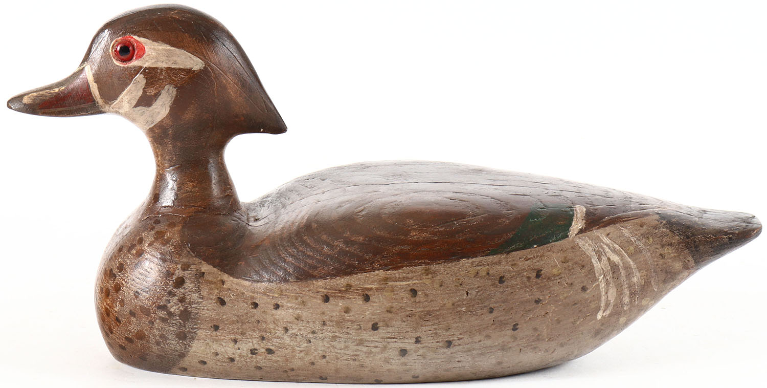 Woodduck Hen by unknown maker, glass eyes, solid wood, original paint, structurally excellent. Gade: Excellent + - Value: 10 to 40