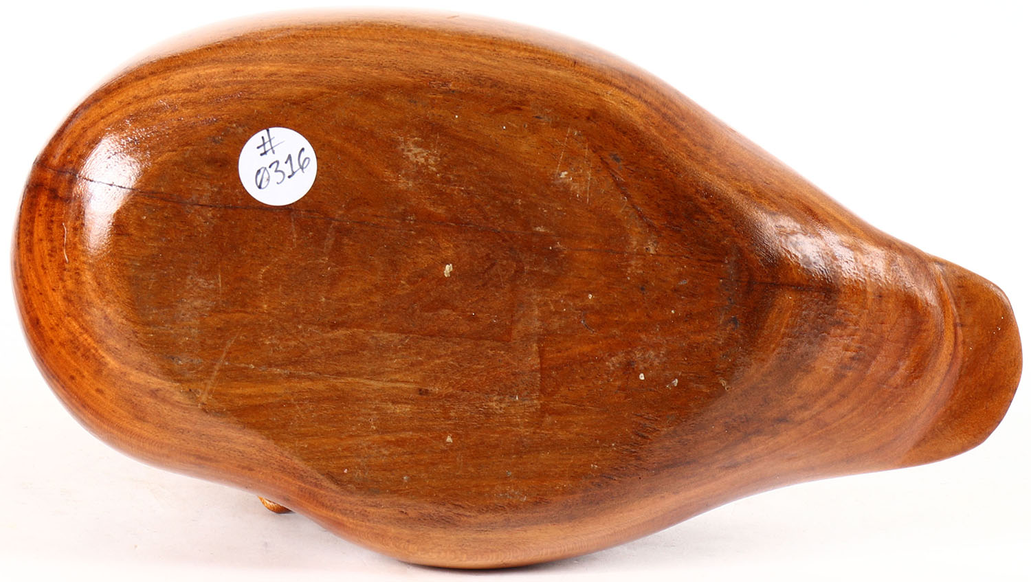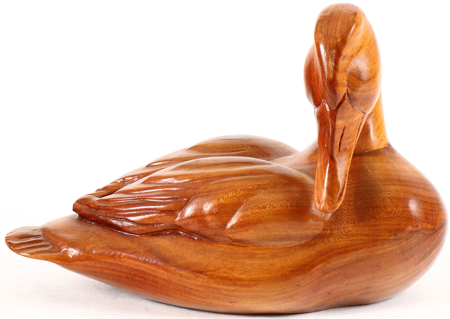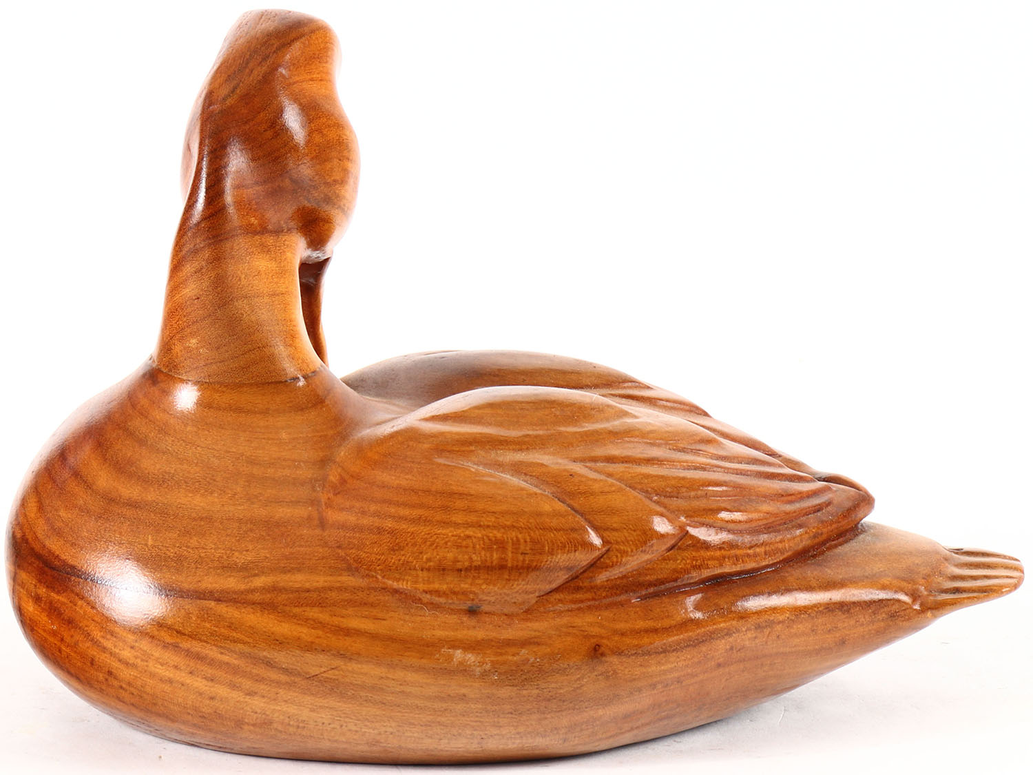Preening Mallard by unknown maker, no eyes, solid wood, original stain, structurally excellent. Grade: Excellent + - Value: 6 to 20