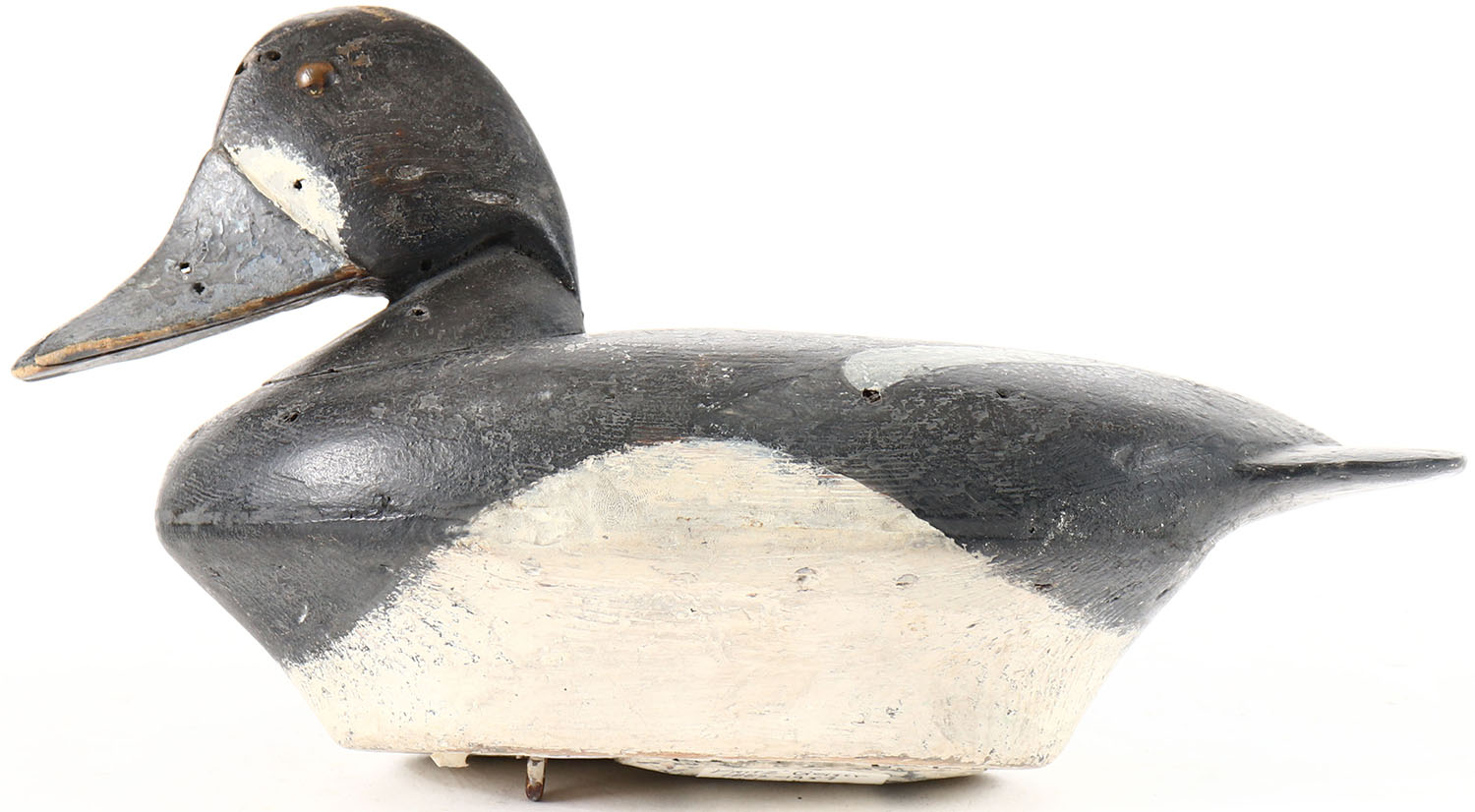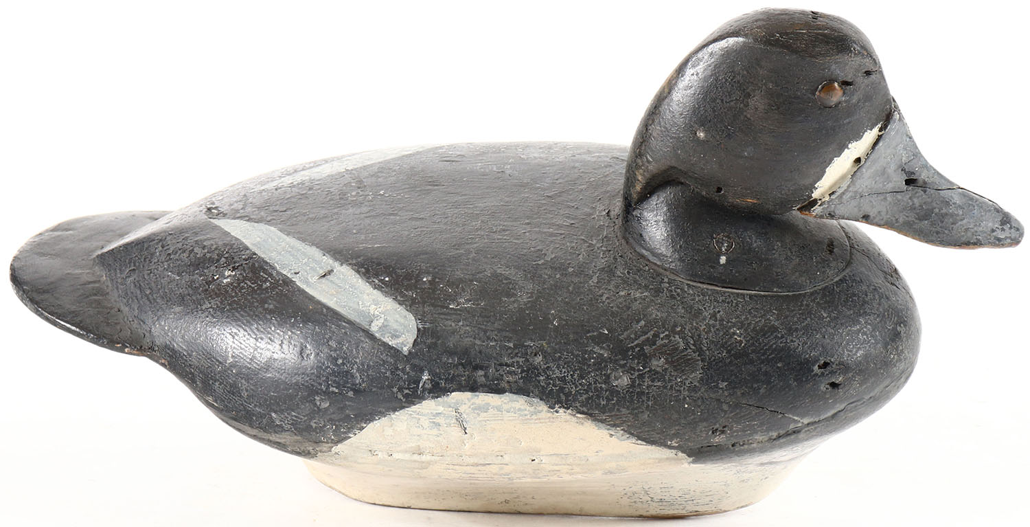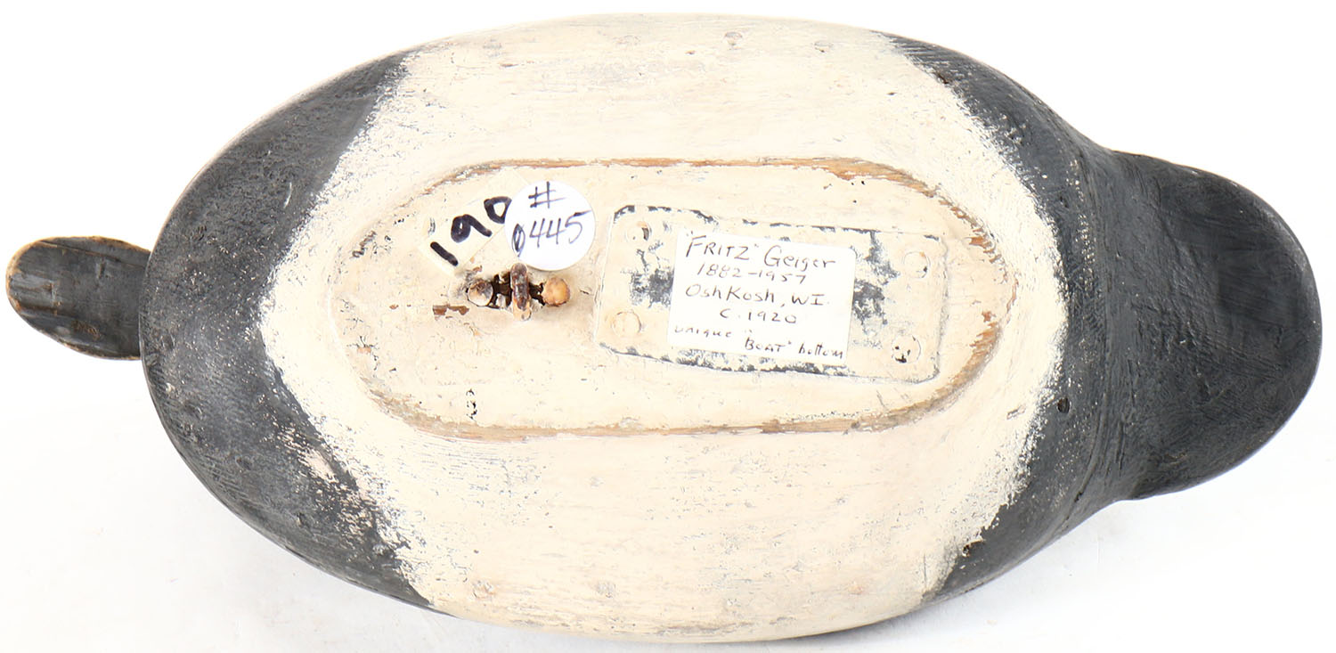 Bluebill Drake by ''Fritz'' Geiger, Oshkosh, WI, tack eyes, solid wood, boat bottom, original paint. Grade: Very Good ++ - Value: 10 to 30