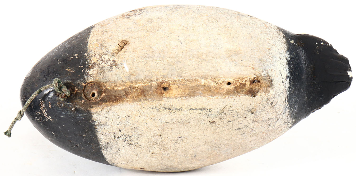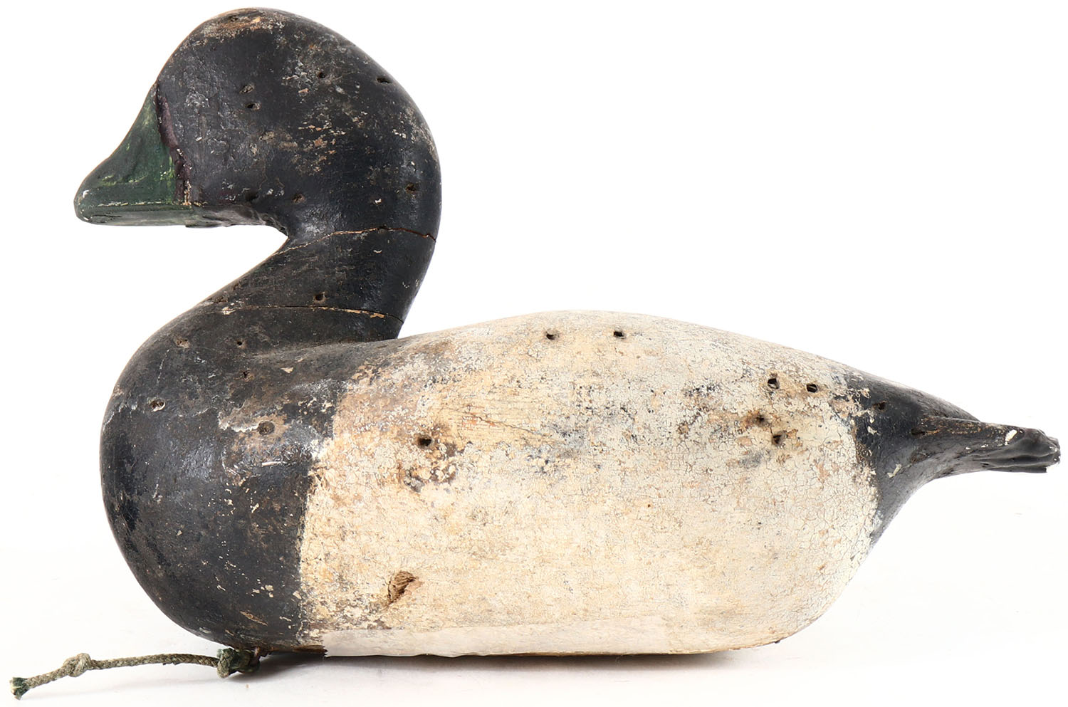 Bluebill Drake by unknown maker, no eyes, solid wood, original paint, neck has cracks. Grade: Very Good + - Value: 10 to 20
