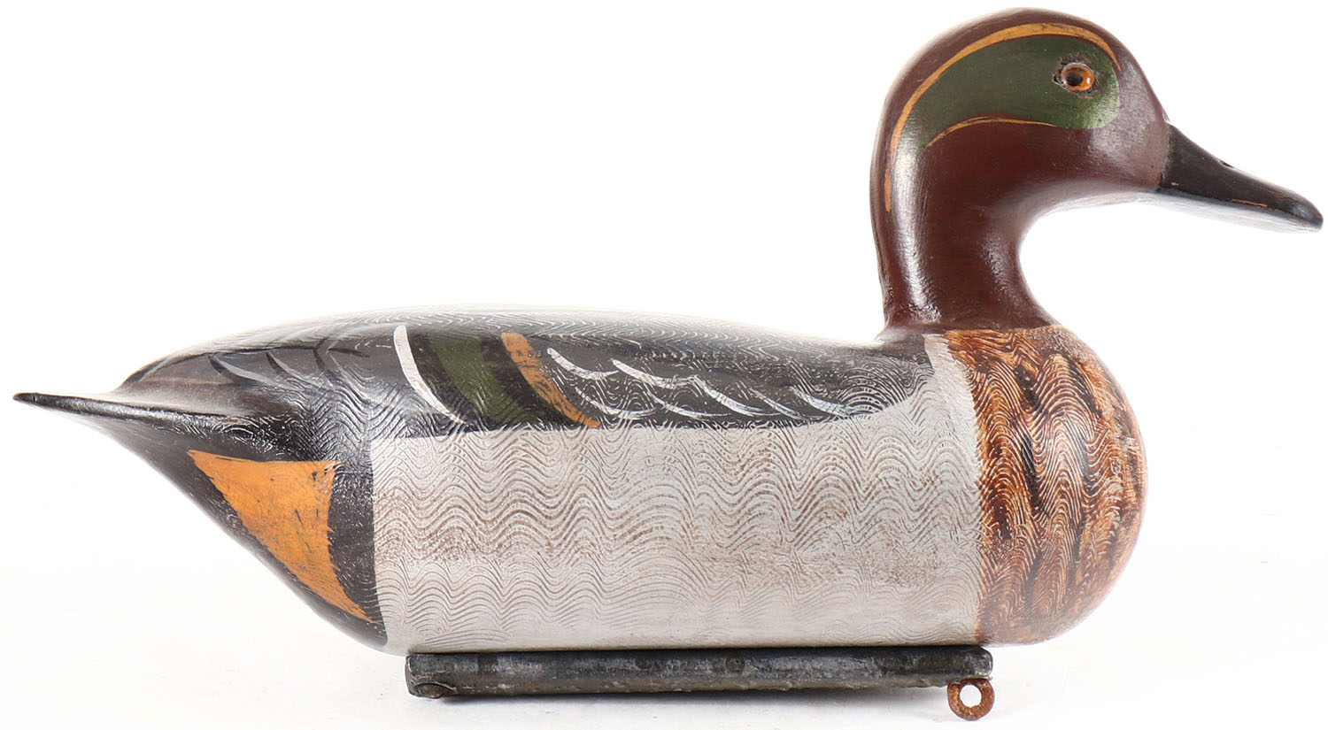 Green Winged Teal Drake by Charlie Moore, Dekalb, IL, glass eyes, Charlie Perdew model with contemporary Perdew weight, solid wood, original paint, structurally excellent. Grade: Excellent + - Value: 40 to 80
