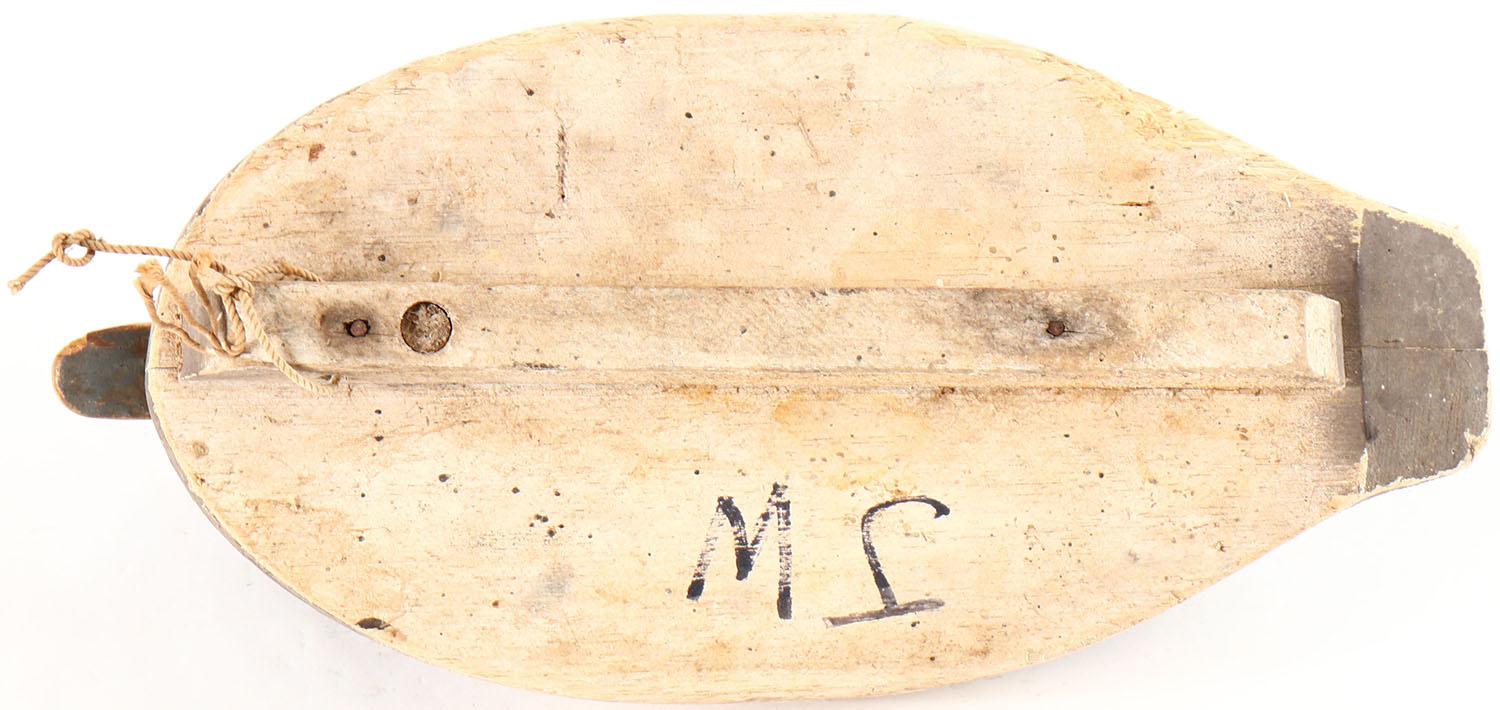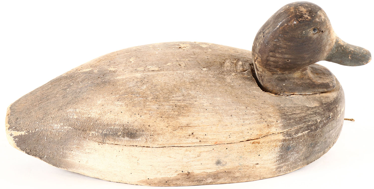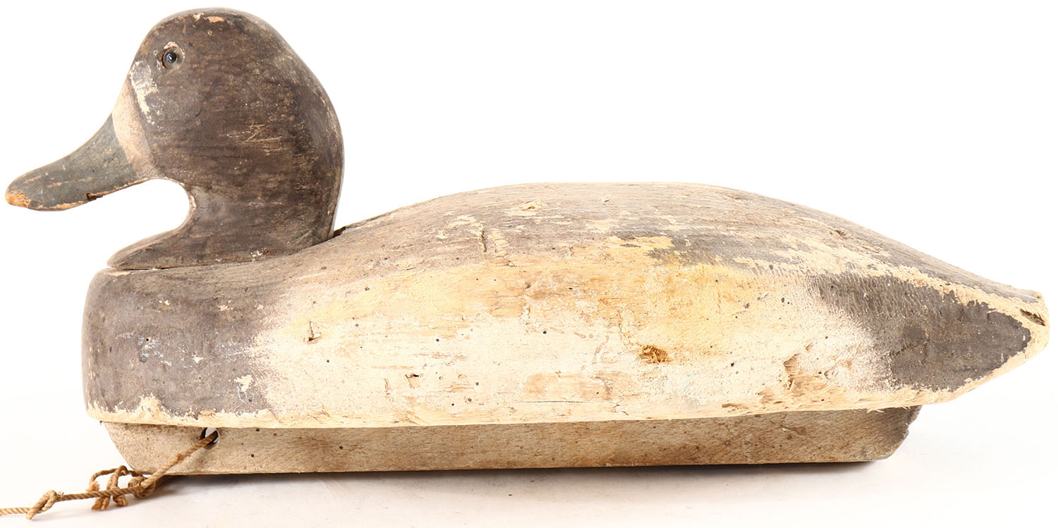 Bluebill Drake by Herters Decoy Co., Waseca, MN, glass eyes, solid balsa wood, original paint with typical wear, age cracks on back. Grade: Very Good + - Value: 10 to 20