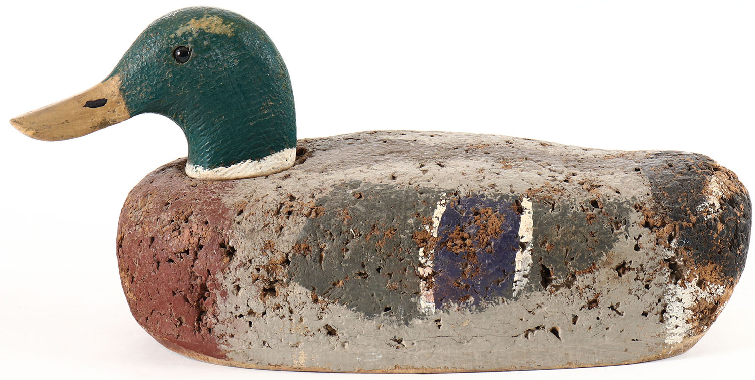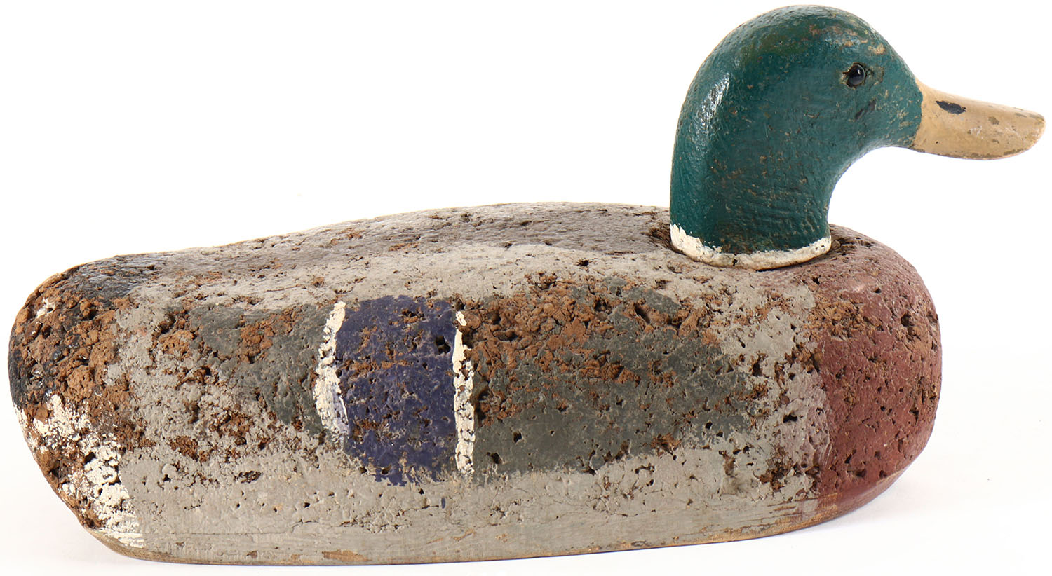 Mallard Drake by Nimrod Dux Decoys, Minneapolis, MN, glass eyes, solid cork body, original paint, structurally excellent, company branded. Grade: Very Good ++ - Value: 10 to 20