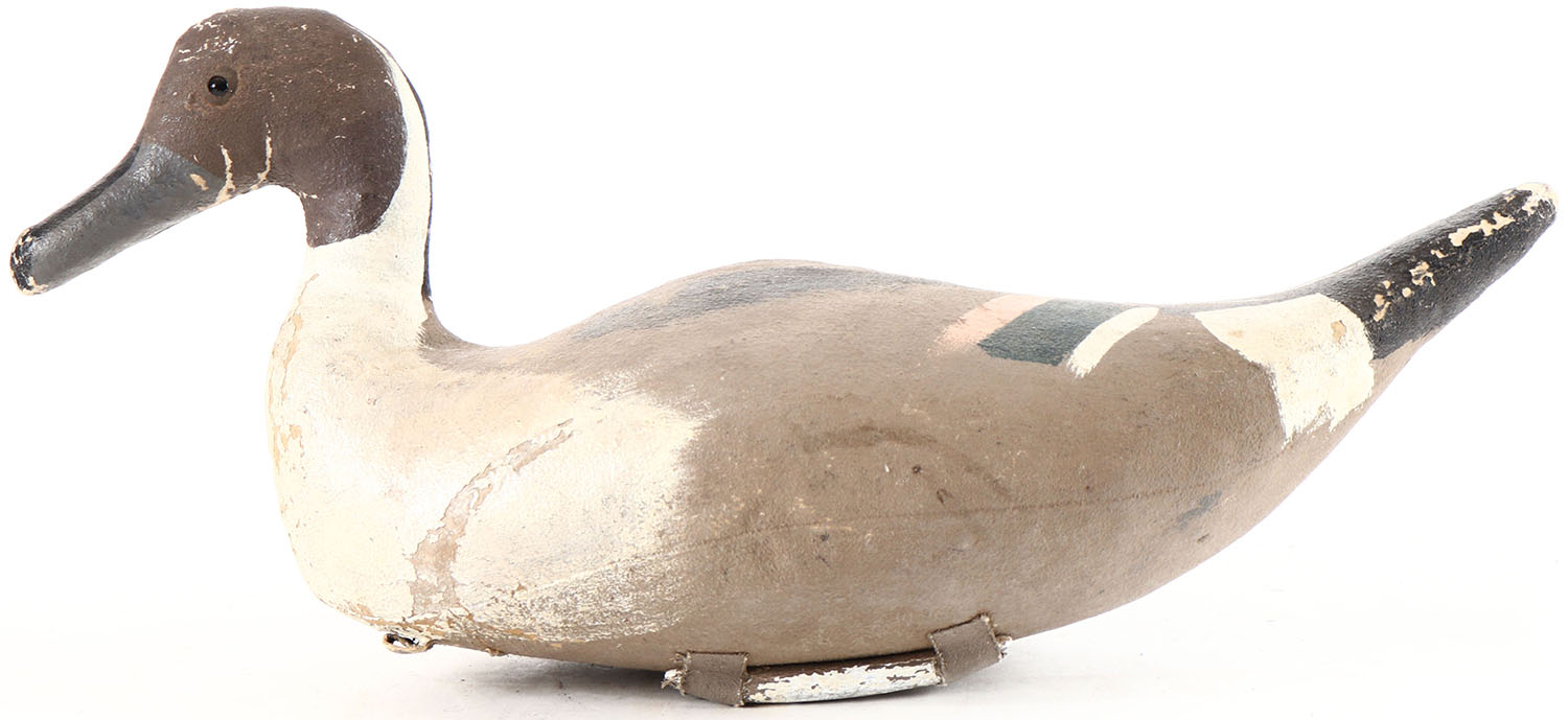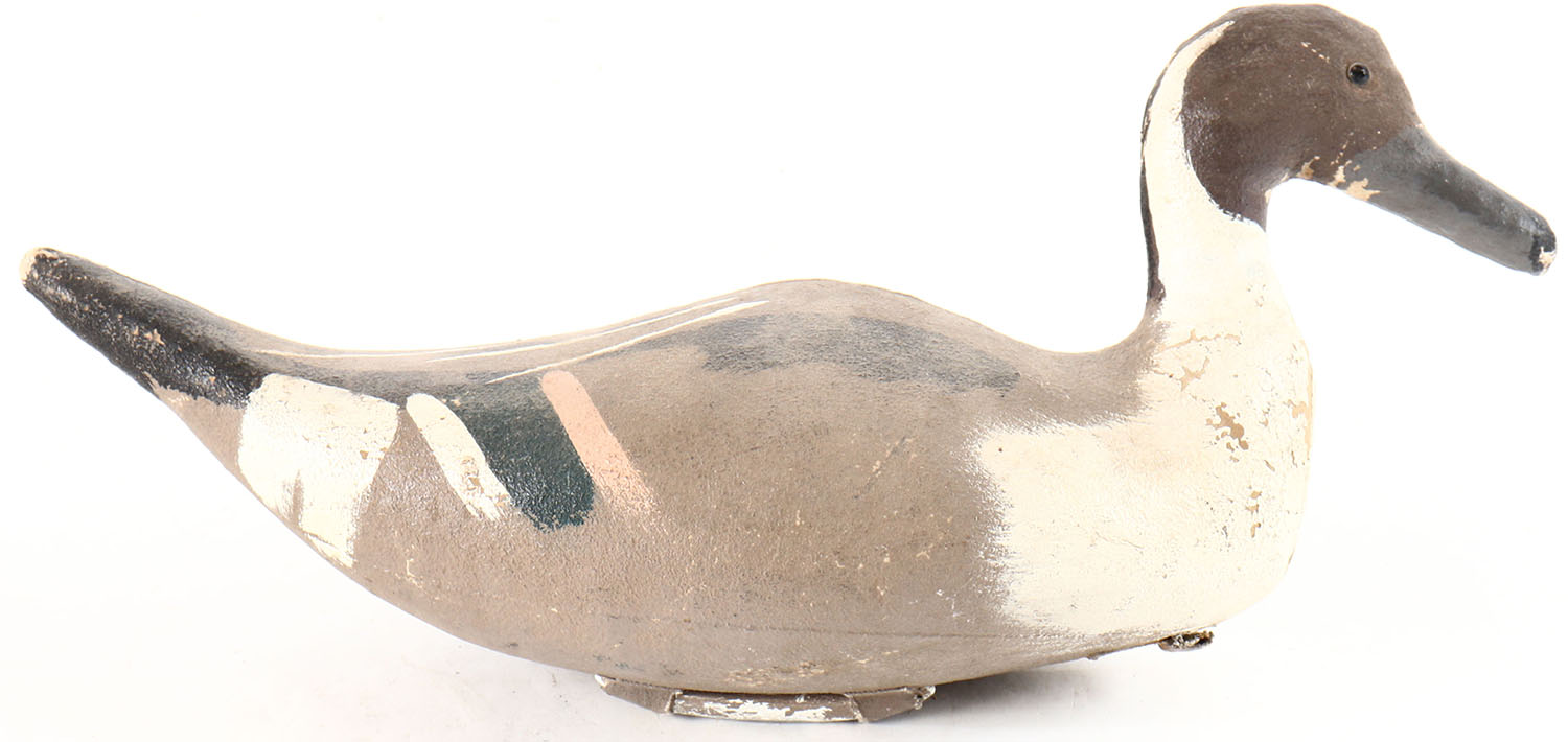 Pintail Drake by Scott Decoy Co., Oakland, CA, glass eyes, canvas over cork, original paint, paint chips on body. Grade: Very Good ++ - Value: 50 to 200