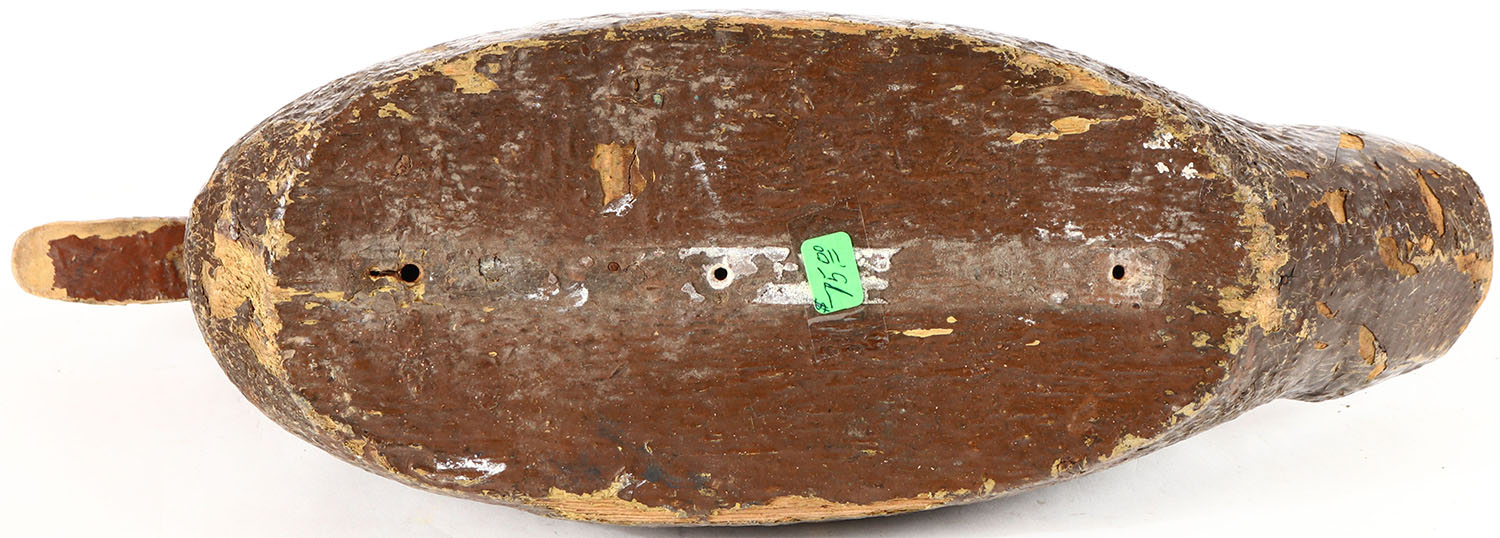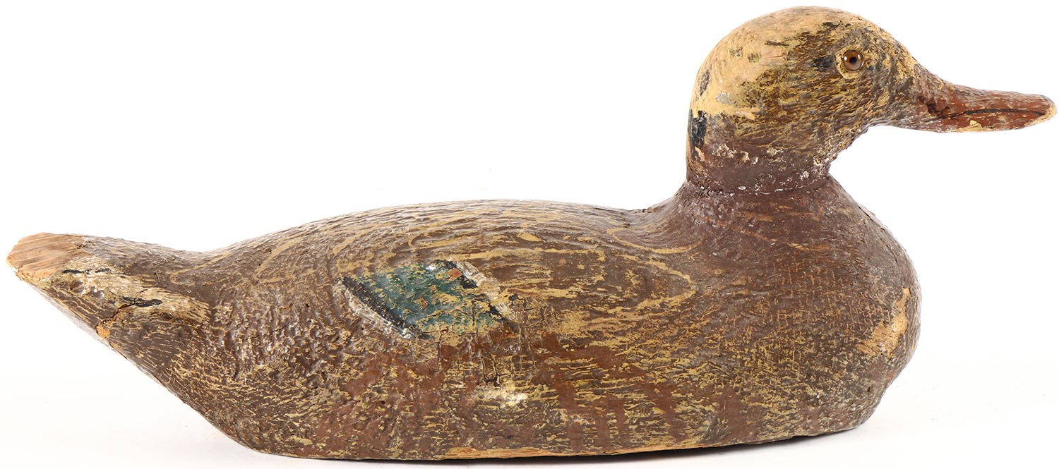 Mallard Hen by Gundelfinger, Jefferson City, MO, glass eyes, solid wood, original paint, entire body has normal paint flaking and tail top sliver missing. Grade: Very Good ++ - Value: 16 to 60