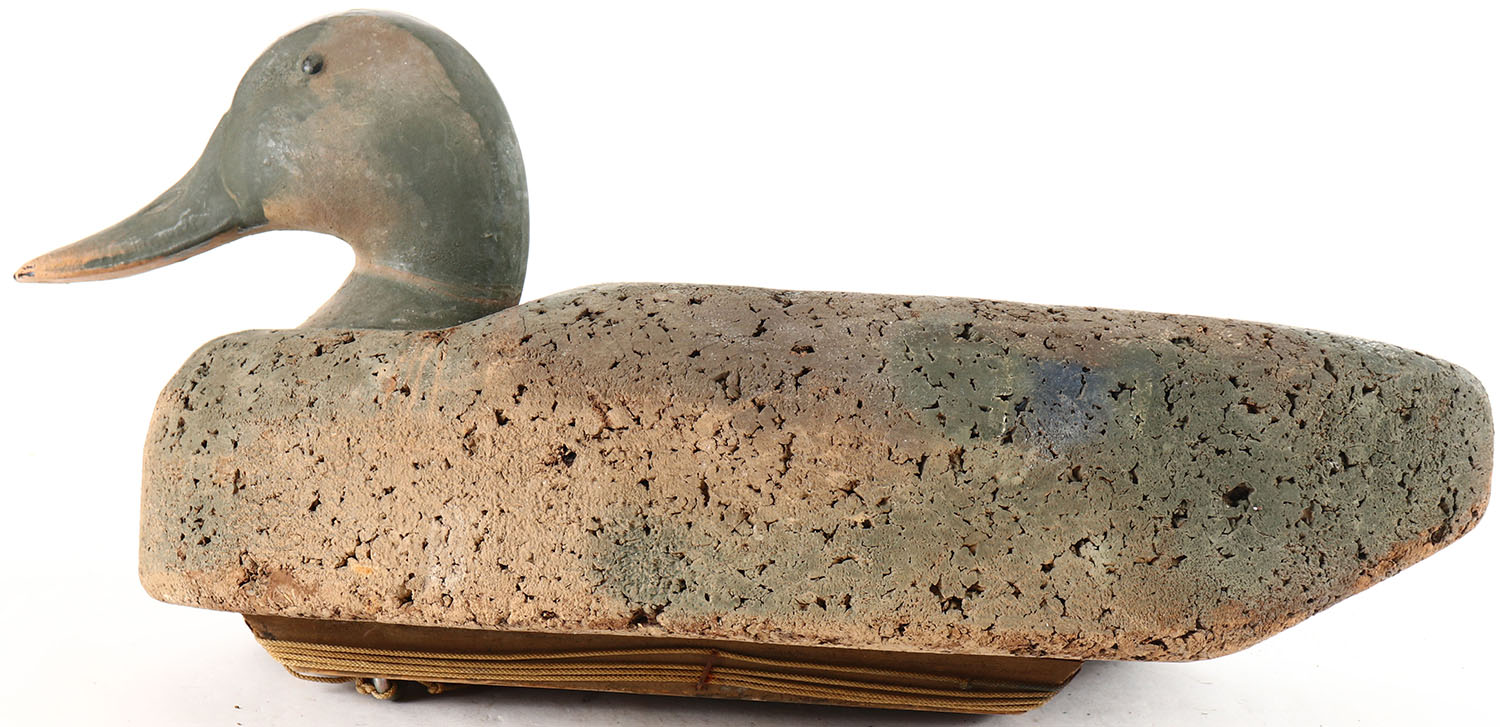 Mallard Drake by unknown maker, glass eyes, solid cork body, original paint, structurally excellent. Grade: Very Good ++ - Value: 6 to 10