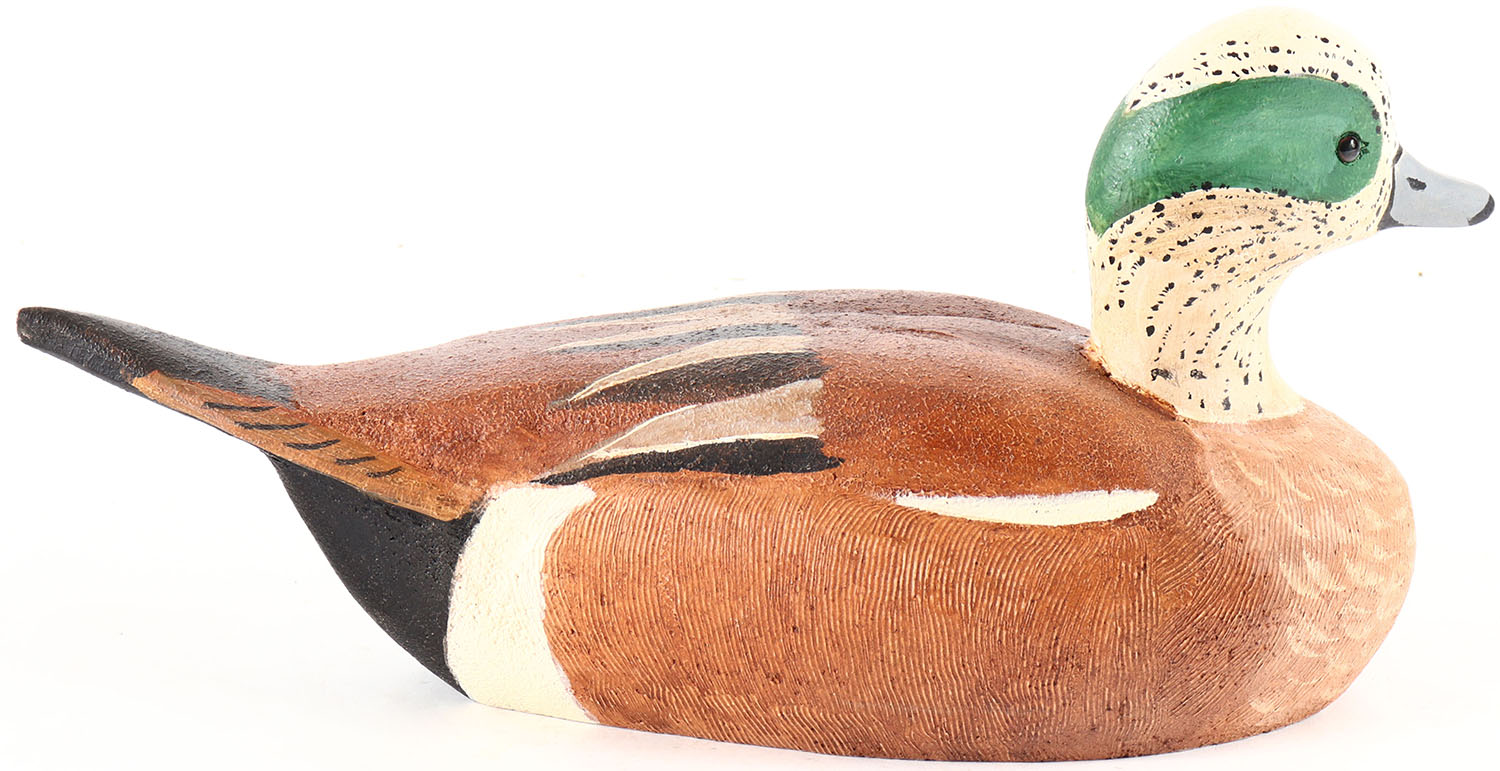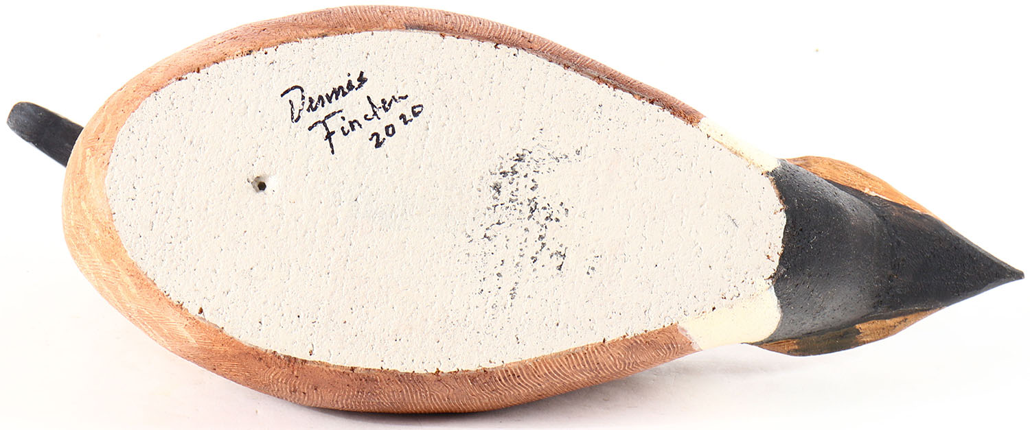 Widgeon Drake by Dennis Finden, South St. Paul, MN, glass eyes, solid cork body, repainted, structurally excellent, signed by DENNIS FINDEN on bottom. Grade: Excellent + - Value: 10 to 30