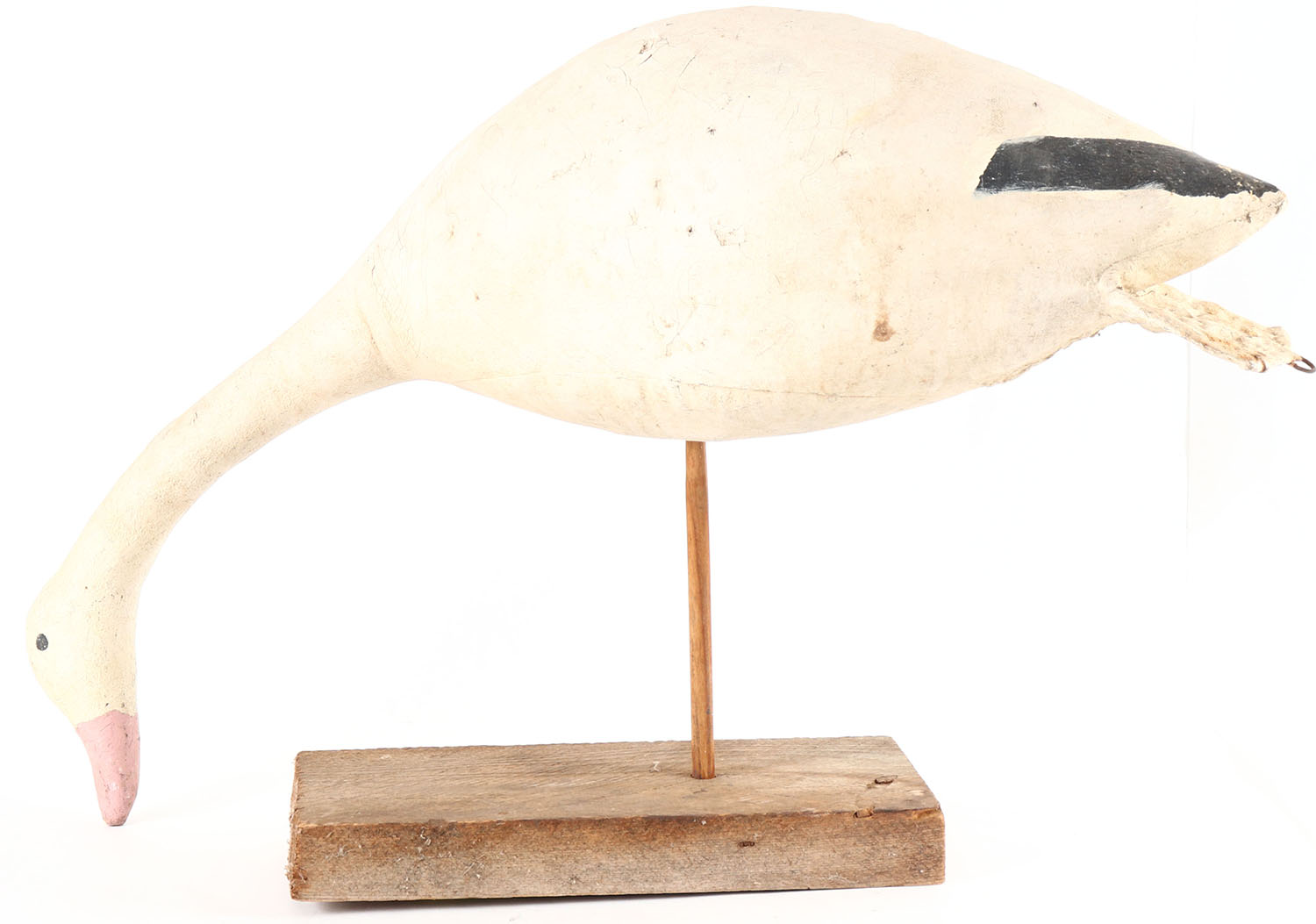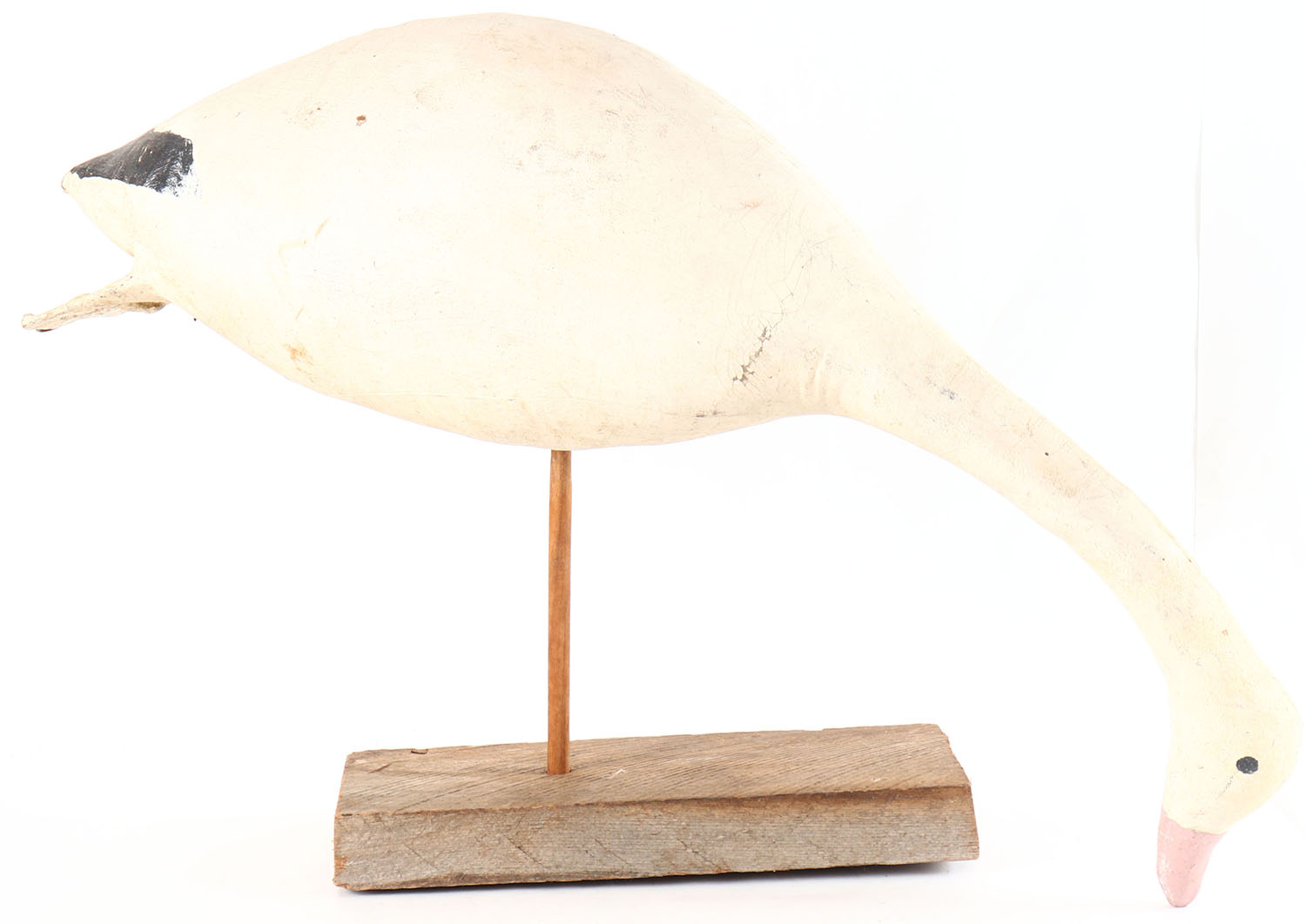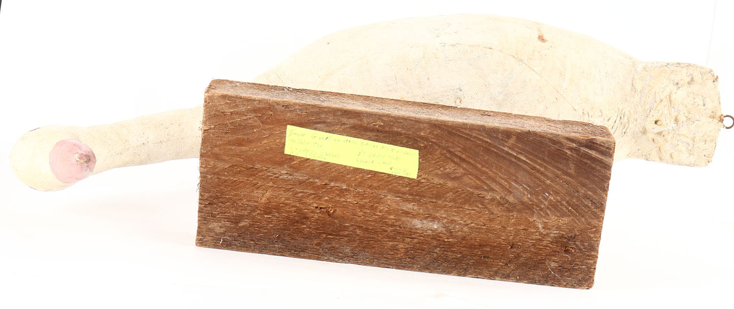 Snow Goose on stand by Calvin Niles, painted eyes, canvas over cork on wood stand, original paint, structurally excellent, signed by CALVIN NILES on bottom. Grade: Excellent - Value: 20 to 40