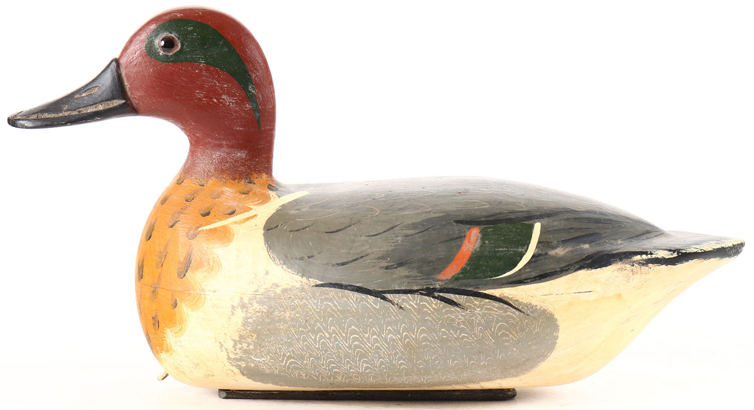 Green Winged Teal Drake by Jim Slack, Pekin, IL, glass eyes, solid wood, original paint, structurally excellent, branded weight. Grade: Excellent + - Value: 60 to 120