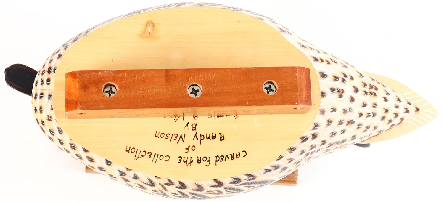 Pintail Hen by multiple world champion Jimmie Vizier, Galliano, LA, for Randy Nelson, on wood stand, glass eyes, solid wood, original paint, structurally excellent with small tail end rub, signed on bottom. Grade: MINT - Value: 400 to 700