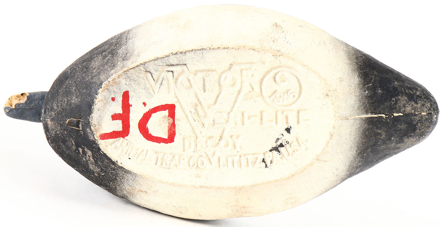 Bluebill Drake by Victor Veri-Lite Decoys, Animal Trap Co. Lititz, PA, glass eyes, paper mache, original paint, chip on bill, wear to body. Grade: Very Good ++ - Value: 20 to 40
