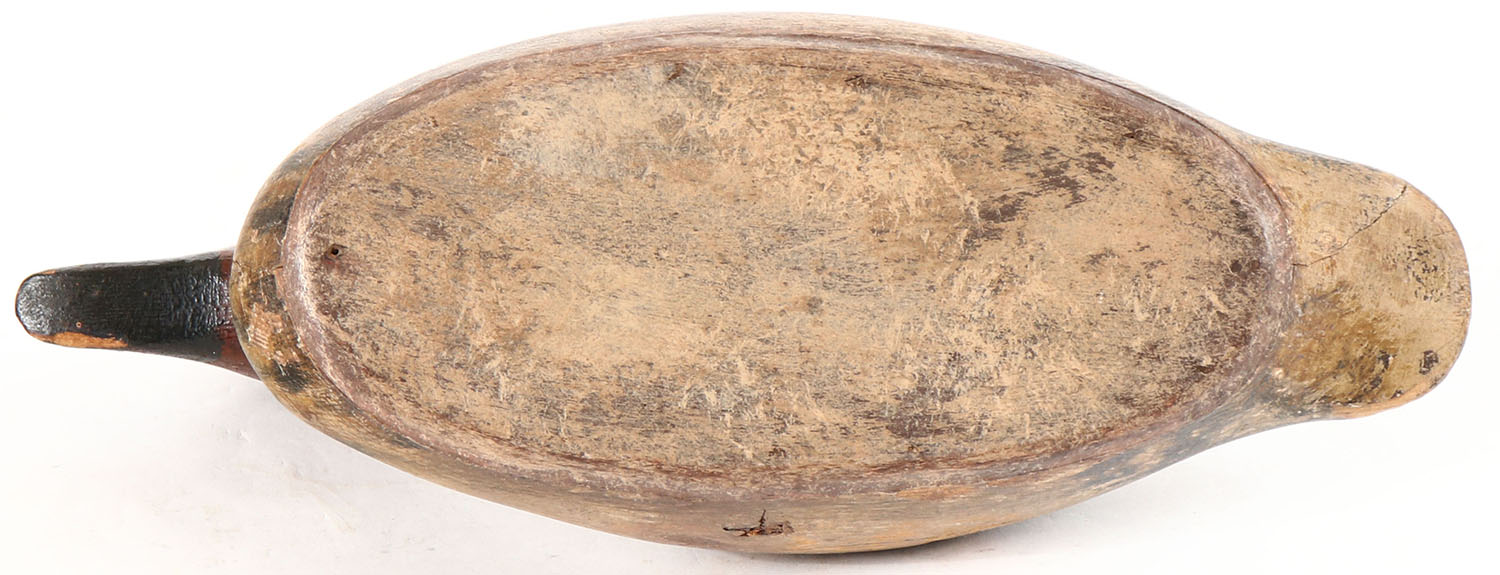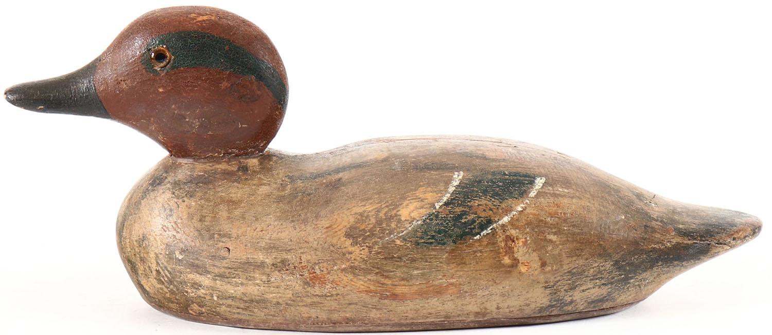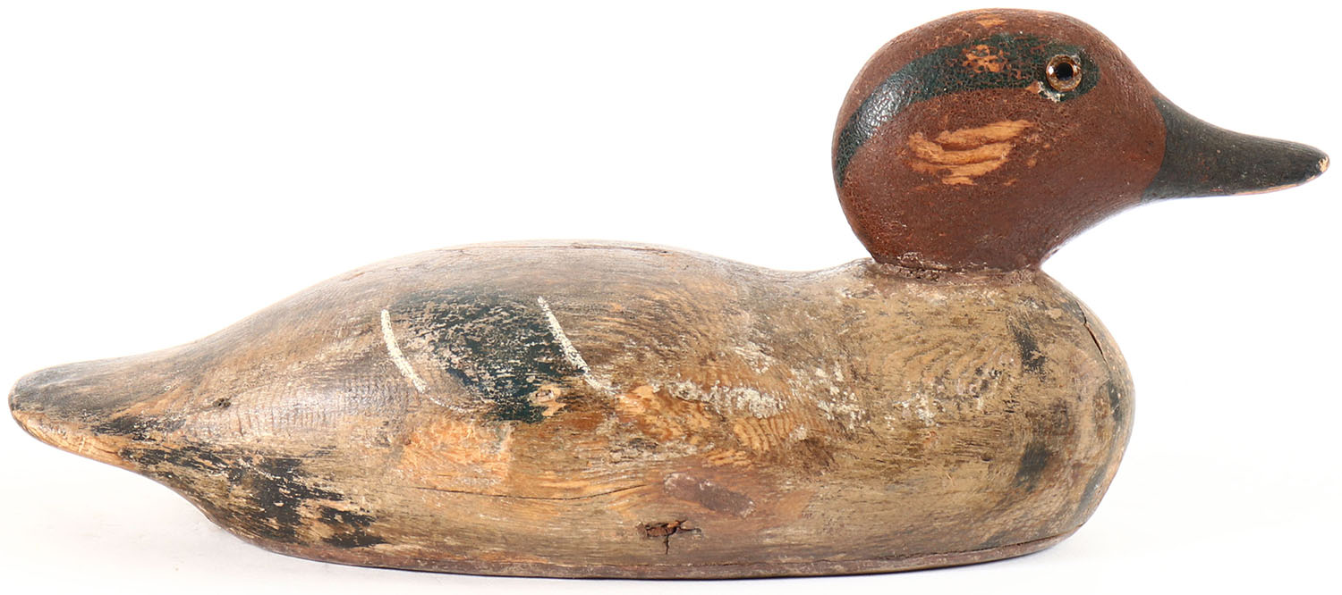 Green Winged Teal Drake by Mason Decoy Company, Detroit, MI, 1896-1924, glass eyes, solid wood, possible original paint head placed on a flat bottom Mason body with worn and over paint, has age crack on back. Grade: Very Good ++ - Value: 70 to 150