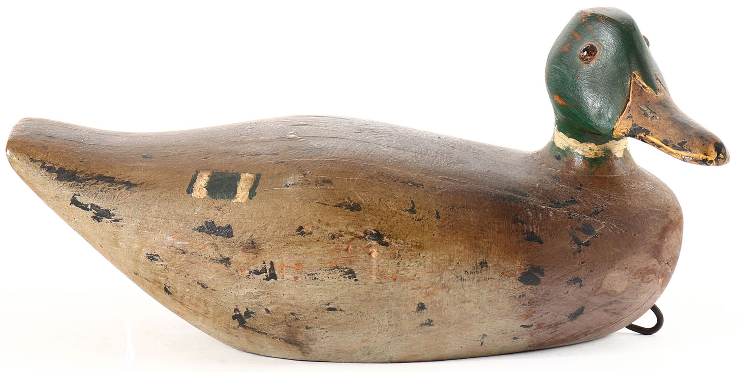 Mallard Drake by unknown maker, glass eyes, solid wood, original paint, has age cracks on back. Grade: Very Good ++ - Value: 10 to 40