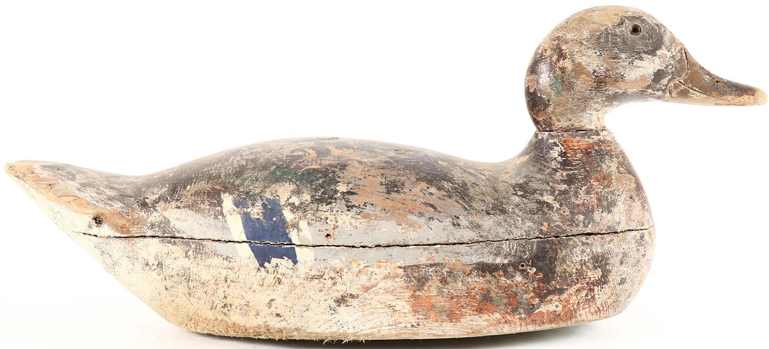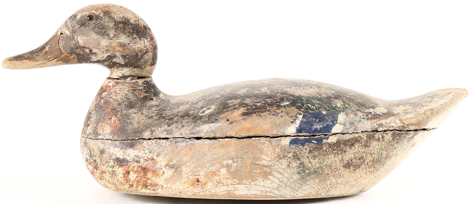 Mallard Hen by Mason Decoy Company, Detroit, MI, 1896-1924, Premier grade, glass eyes, hollow wood, some original and over paint, seam split, edge wear, great restoration candidate. Grade: Very Good ++ - Value: 70 to 150