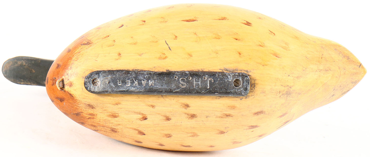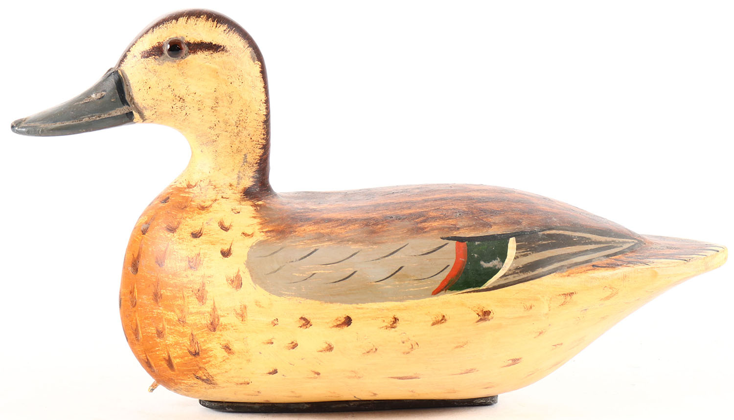 Green Winged Teal Hen by Jim Slack, Pekin, IL, glass eyes, hollow wood, original paint, Jims brand on weight. Grade: Excellent + - Value: 40 to 80