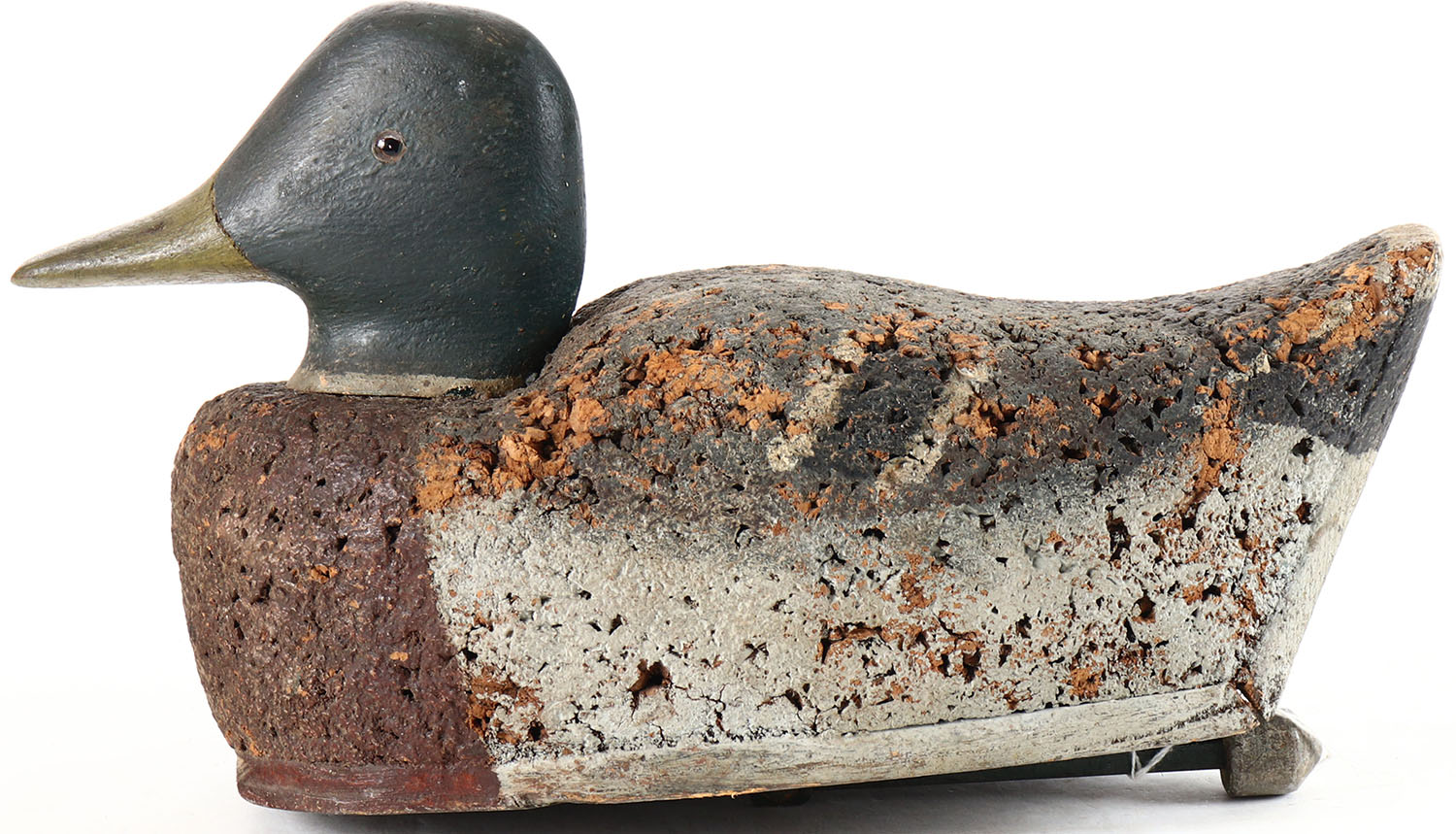 Mallard Drake by unknown Wisconsin maker, glass eyes, solid cork body, original paint, structurally excellent. Grade: Excellent - Value: 10 to 40