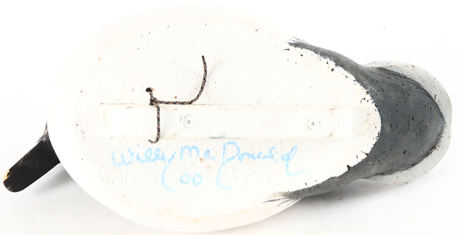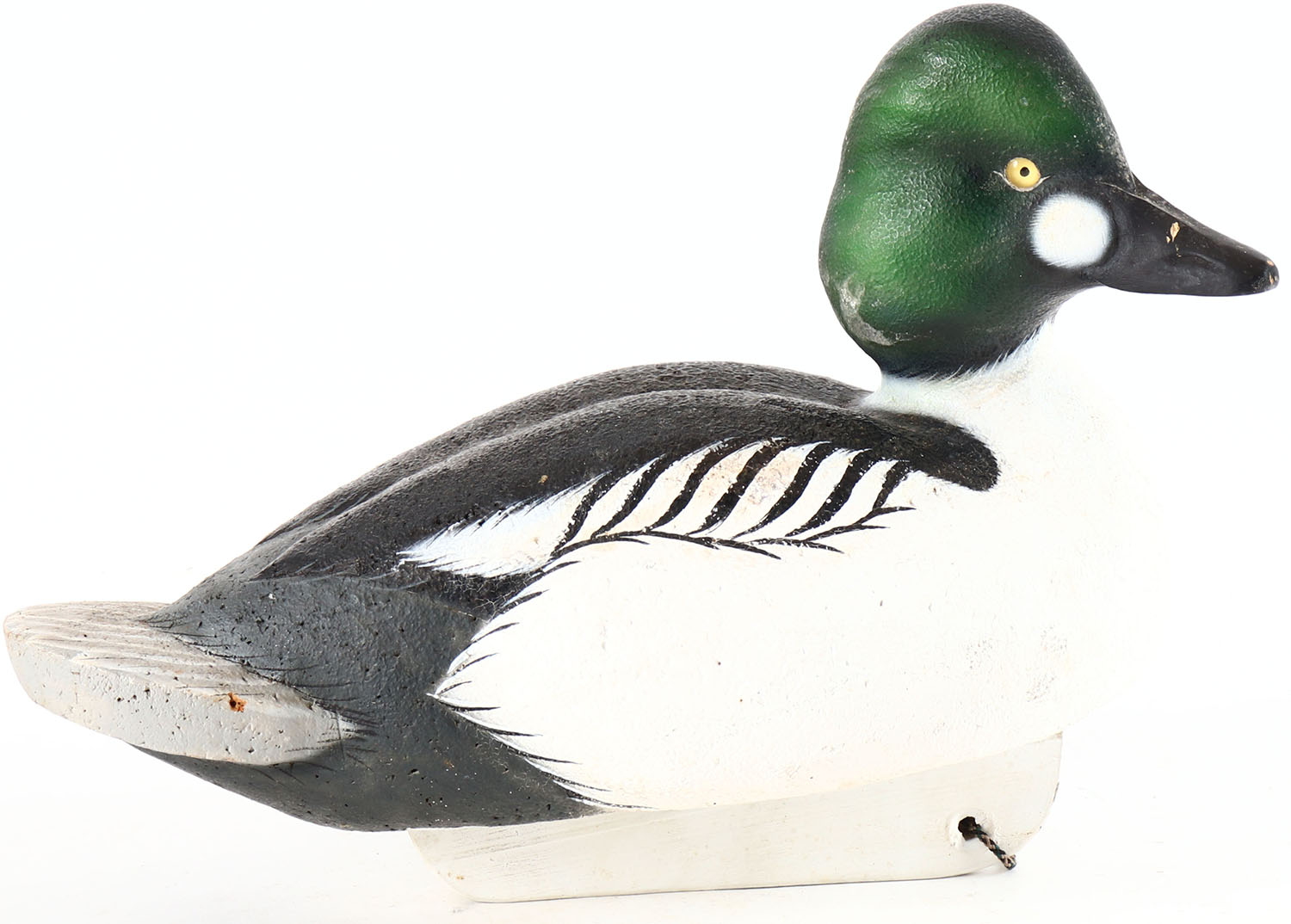 Goldeneye Drake by Willy McDonald, glass eyes, solid cork body, original paint, has chips on bill. Grade: Very Good ++ - Value: 10 to 40