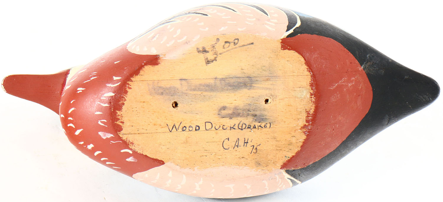 Woodduck Drake by CAH, glass eyes, hollow wood, original paint, structurally excellent. Grade: Excellent + - Value: 10 to 30