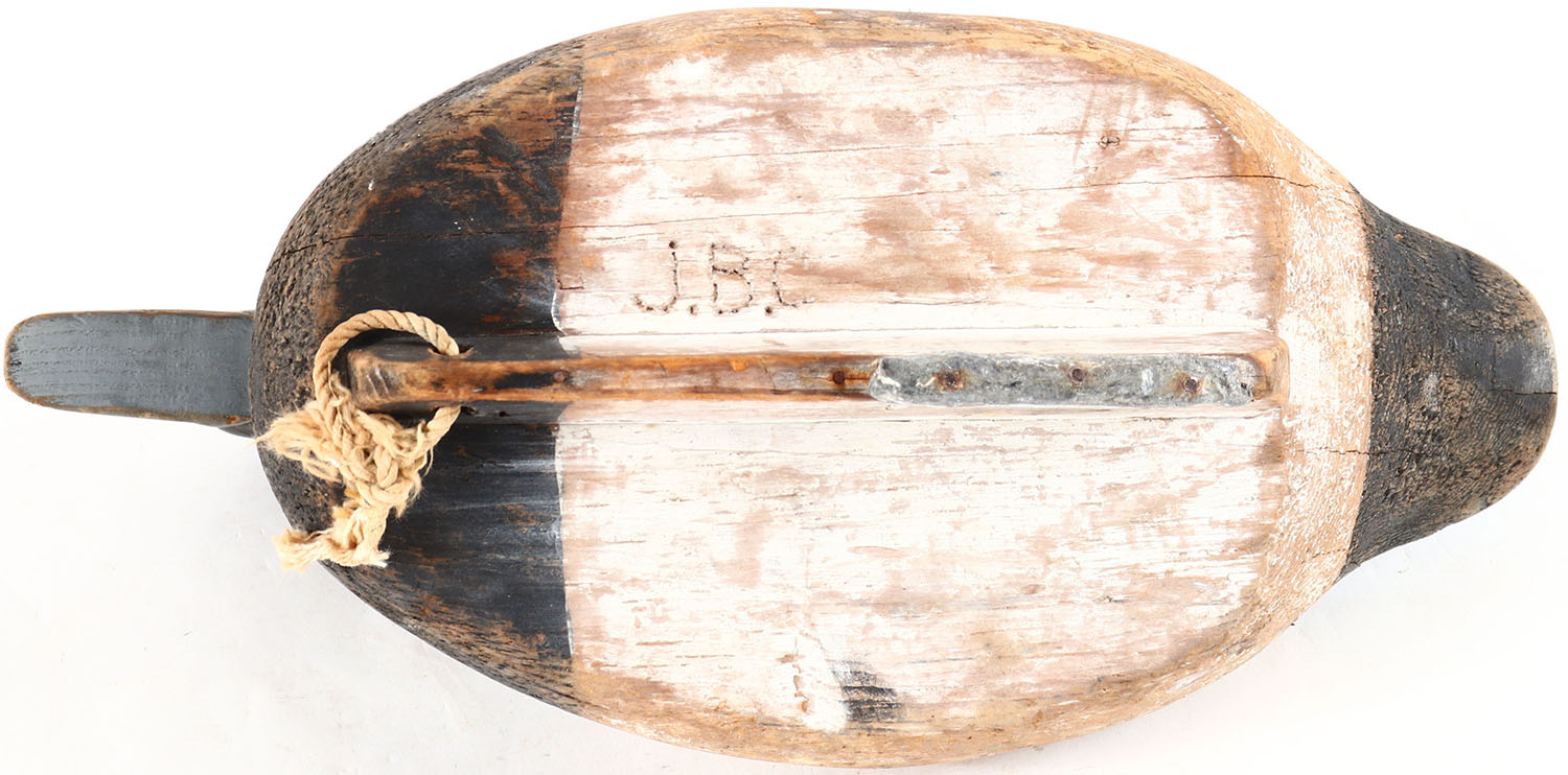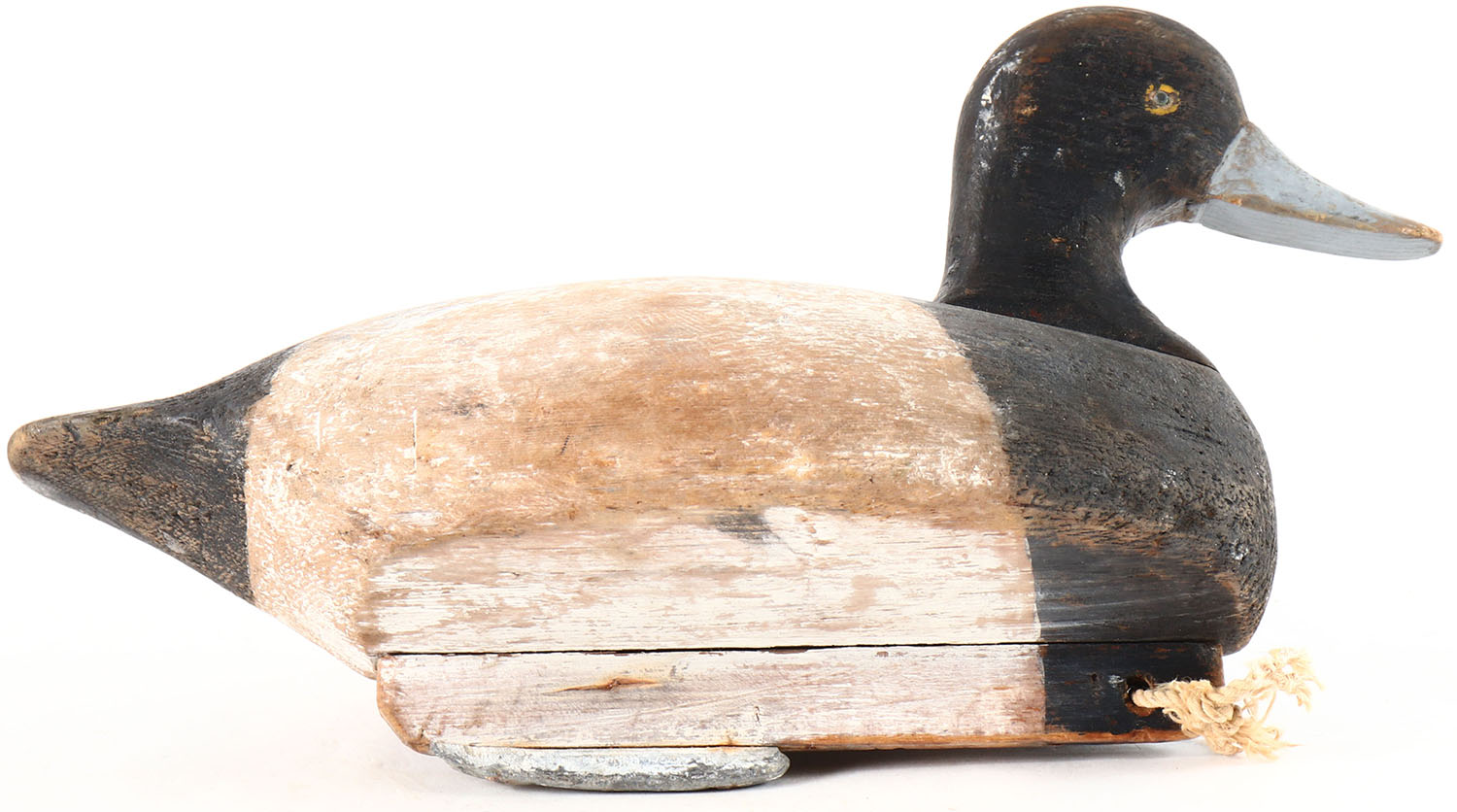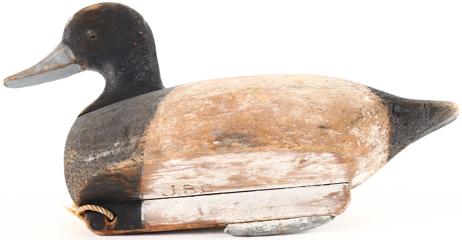 Bluebill Drake by unknown maker, painted eyes, hollow wood, original paint, wear to body, has age cracks on back and bottom. Grade: Very Good + - Value: 10 to 30